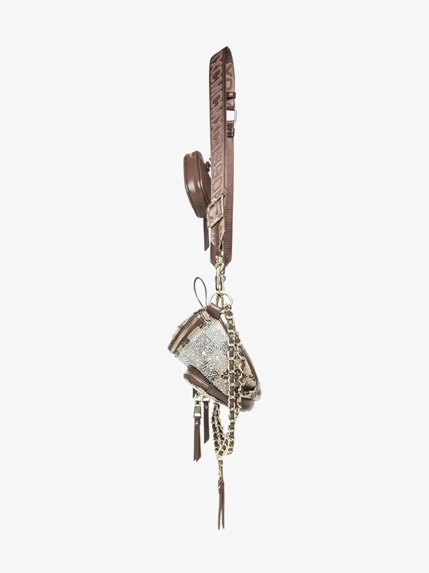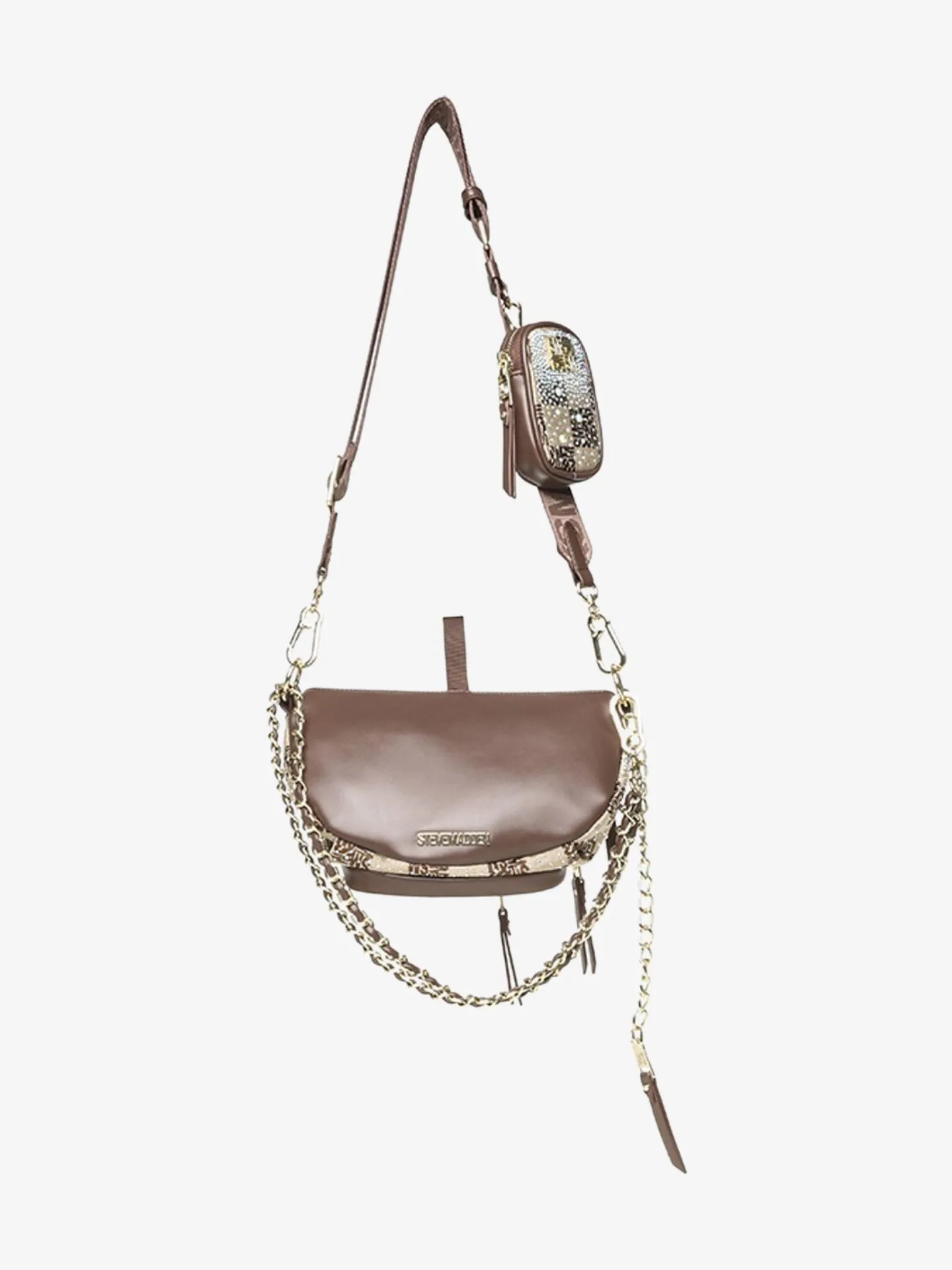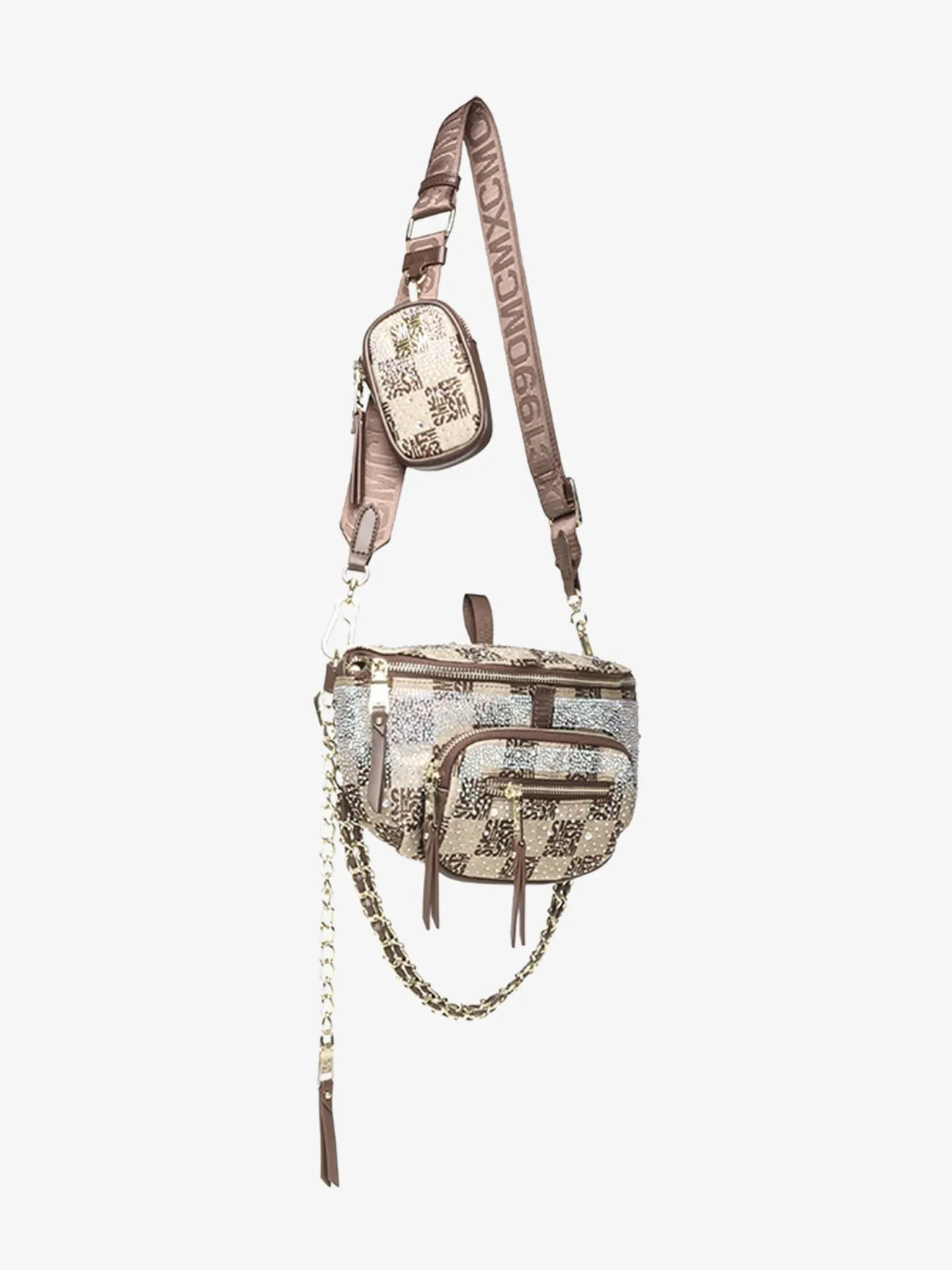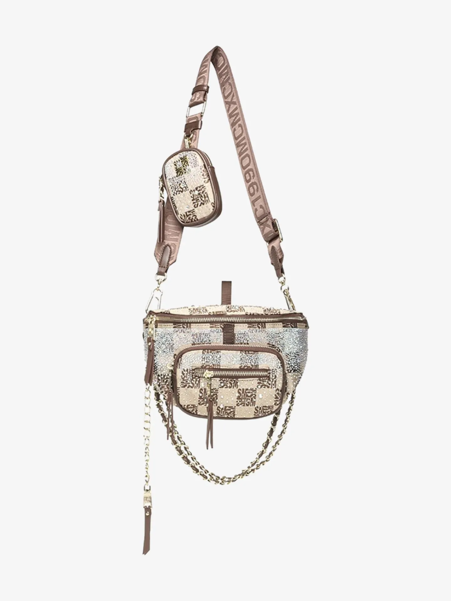 Deze Steve Madden tas is het model genaamd de Bmax12, een trendy heup- of crossbody-tas met een opvallende print. De tas heeft een eigentijdse dambordprint in bruin, waarbij de donkere vakjes zijn opgebouwd uit kleine Steve Madden-logo's. De print is op sommige plekken verfraaid met strass-steentjes voor een glamoureuze uitstraling