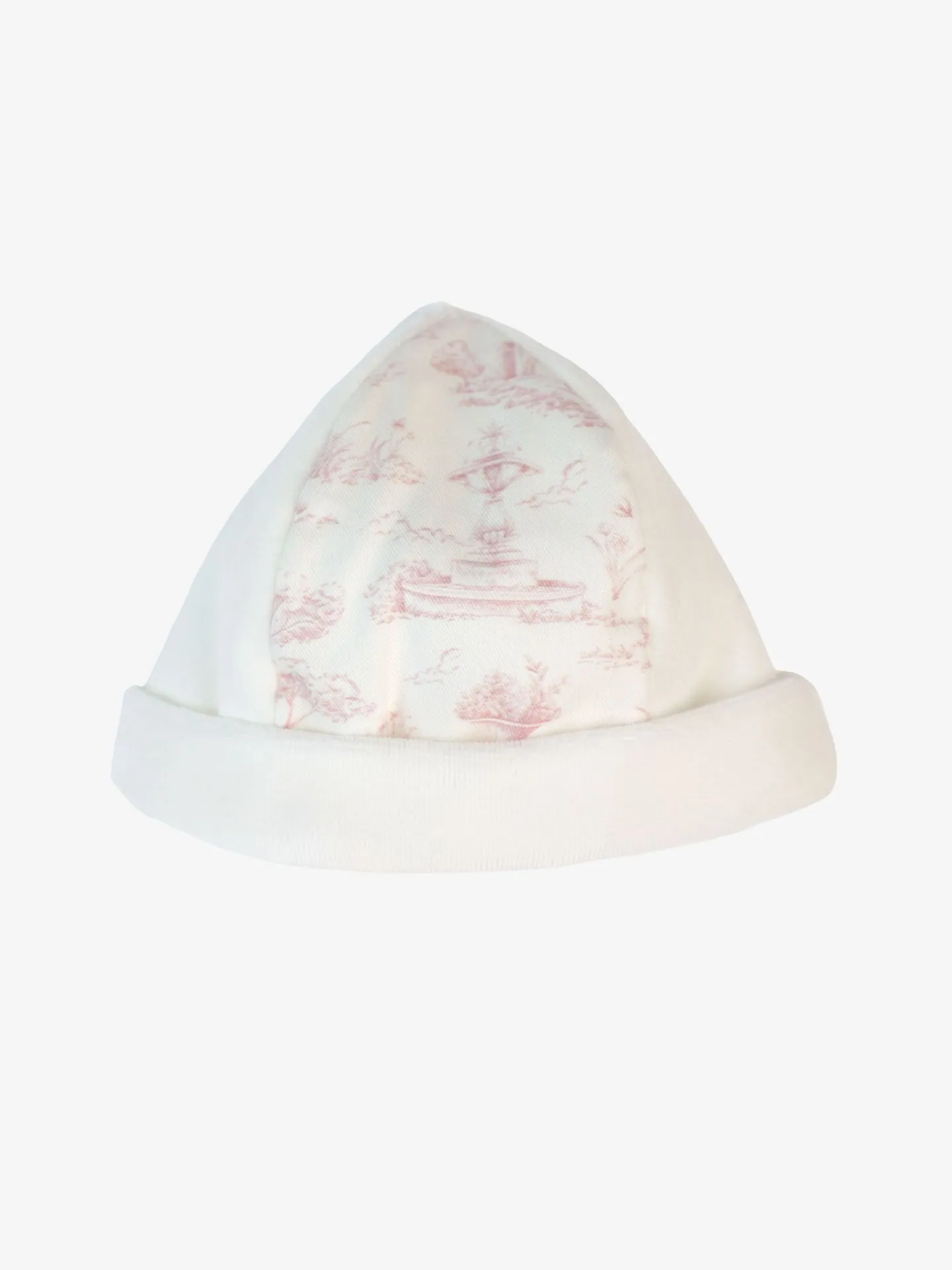 Maak je Baby Gi set helemaal compleet door dit baby mutsje uit de Vintage collectie in de kleur roze. Het mutsje heeft een toile de jouy print, passend bij de Baby Gi boxpakjes.