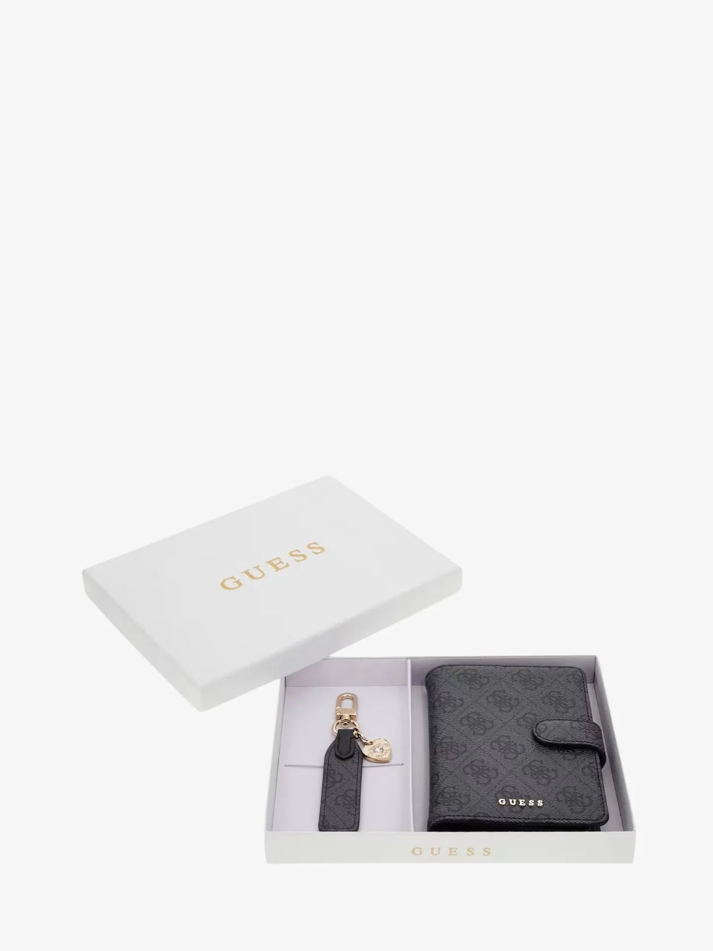 Paspoorthouder en sleutelhanger, buitenkant van kunstleer, sluiting met ring en karabijnhaakje met logo en knoop, licht-goudkleurige metalen onderdelen, 4G-logoprint, charm hart met logo met detail en siersteentjes op sleutelhanger.