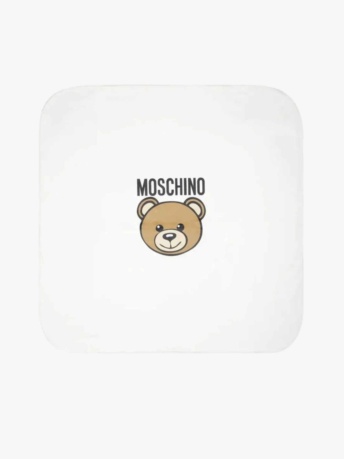 Het Moschino Baby Dekentje in de kleur Cloud heeft het Moschino logo in het midden met het Moschino beertje. Match perfect met het bijpassende boxpakje.