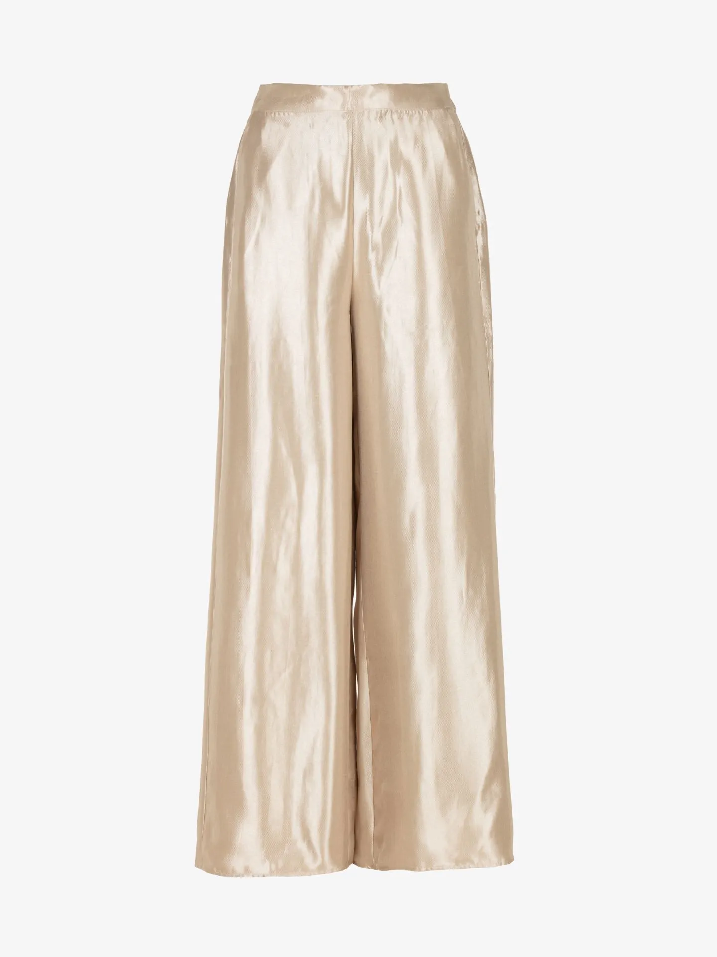 Deze champagnekleurige Freebird broek, modelnamen Panthea, valt op door zijn glanzende, metallic afwerking. Het is een elegant wide-leg (wijde pijpen) model, dat losjes valt voor een comfortabele pasvorm.