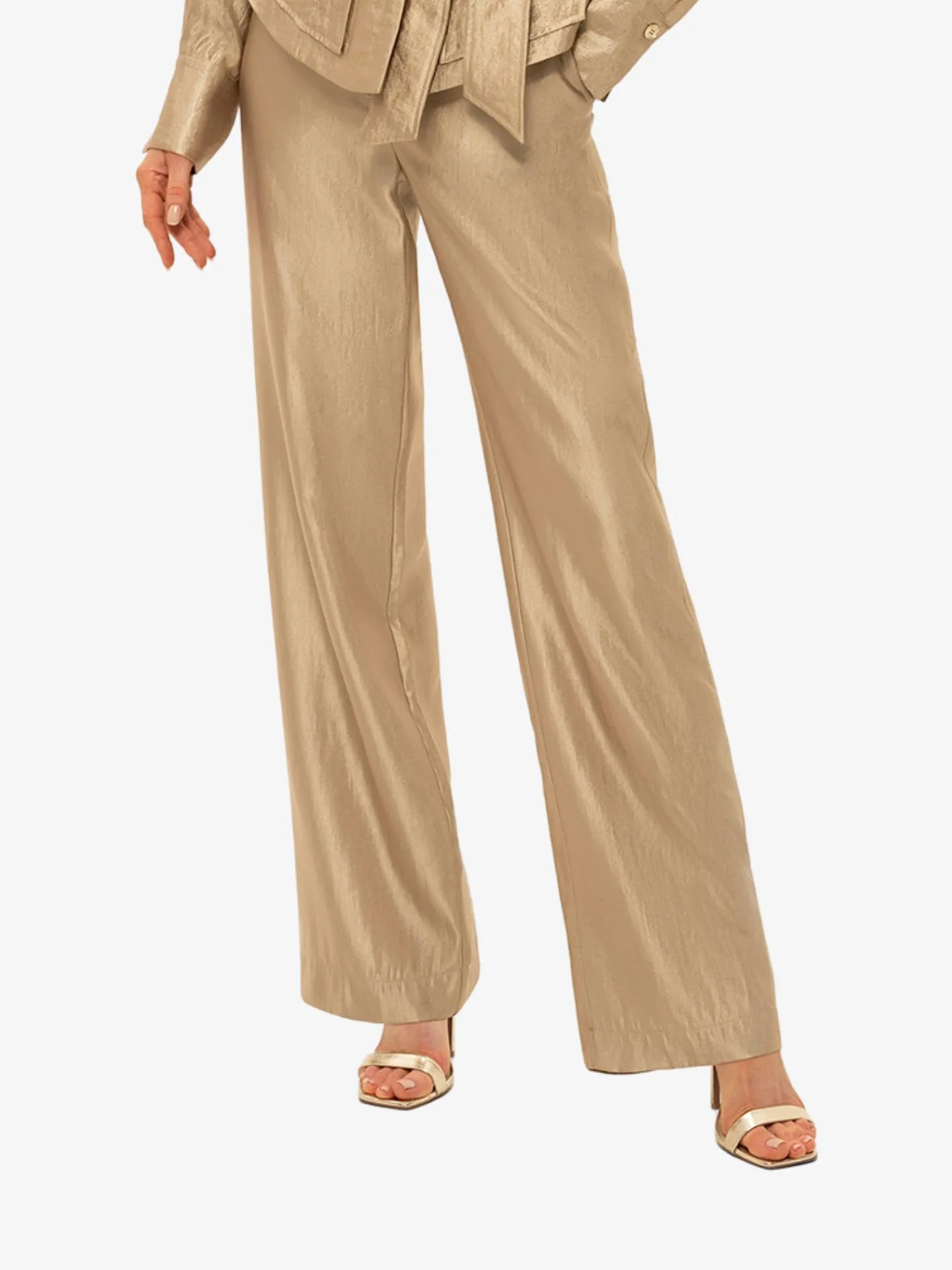 Deze broek heeft een subtiele all-over glitter voor een elegante touch en is voorzien van een hoge taille en wijde pijpen. De rits- en knoopsluiting zorgt voor een nette afwerking, terwijl de elastische tailleband aan de achterkant extra comfort biedt. Met praktische zakken en een normale pasvorm is dit een stijlvolle en veelzijdige broek.