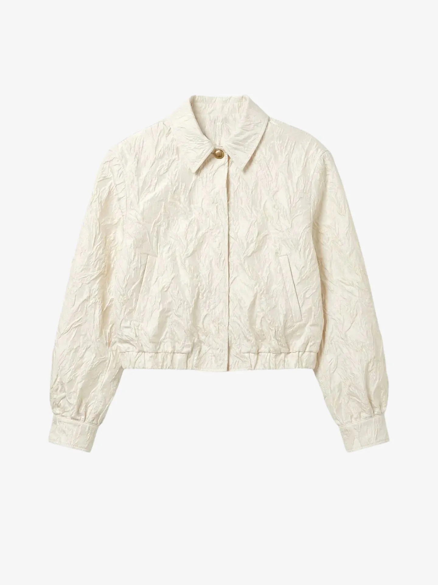 Dit jack heeft een trendy crinkle structuur en is voorzien van een klassieke kraag en een knoopsluiting. De elastische tailleband zorgt voor een comfortabele fit, terwijl de zakken het ontwerp praktisch maken. Dankzij de boxy pasvorm krijgt het jack een moderne en nonchalante uitstraling.