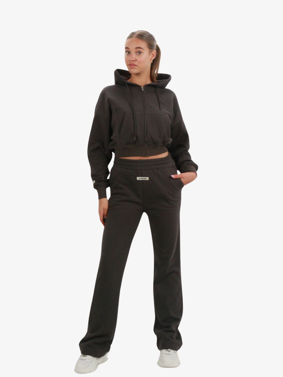 De LA Sisters Essential Cropped Hoodie in de kleur donkergrijs heeft een cropped pasvorm. Het vest heeft een fleecevoering. Combineer het vest samen met de bijpassende LA Sisters broek.