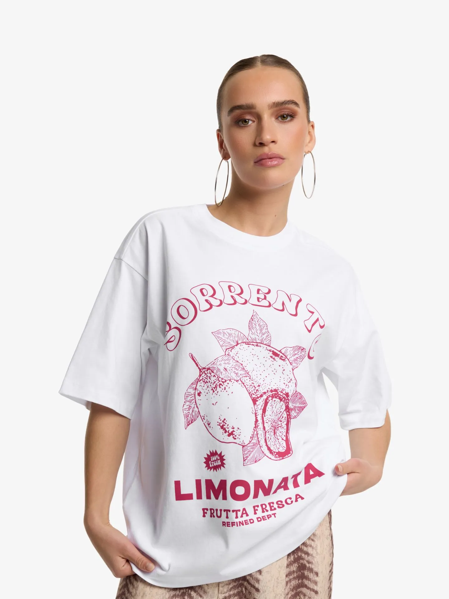 Oversized T-shirt gesneden uit onze zachte katoenen jersey-kwaliteit. Voorzien van een artwork op de voorzijde. Afgewerkt met een geribbelde boord langs de halslijn.