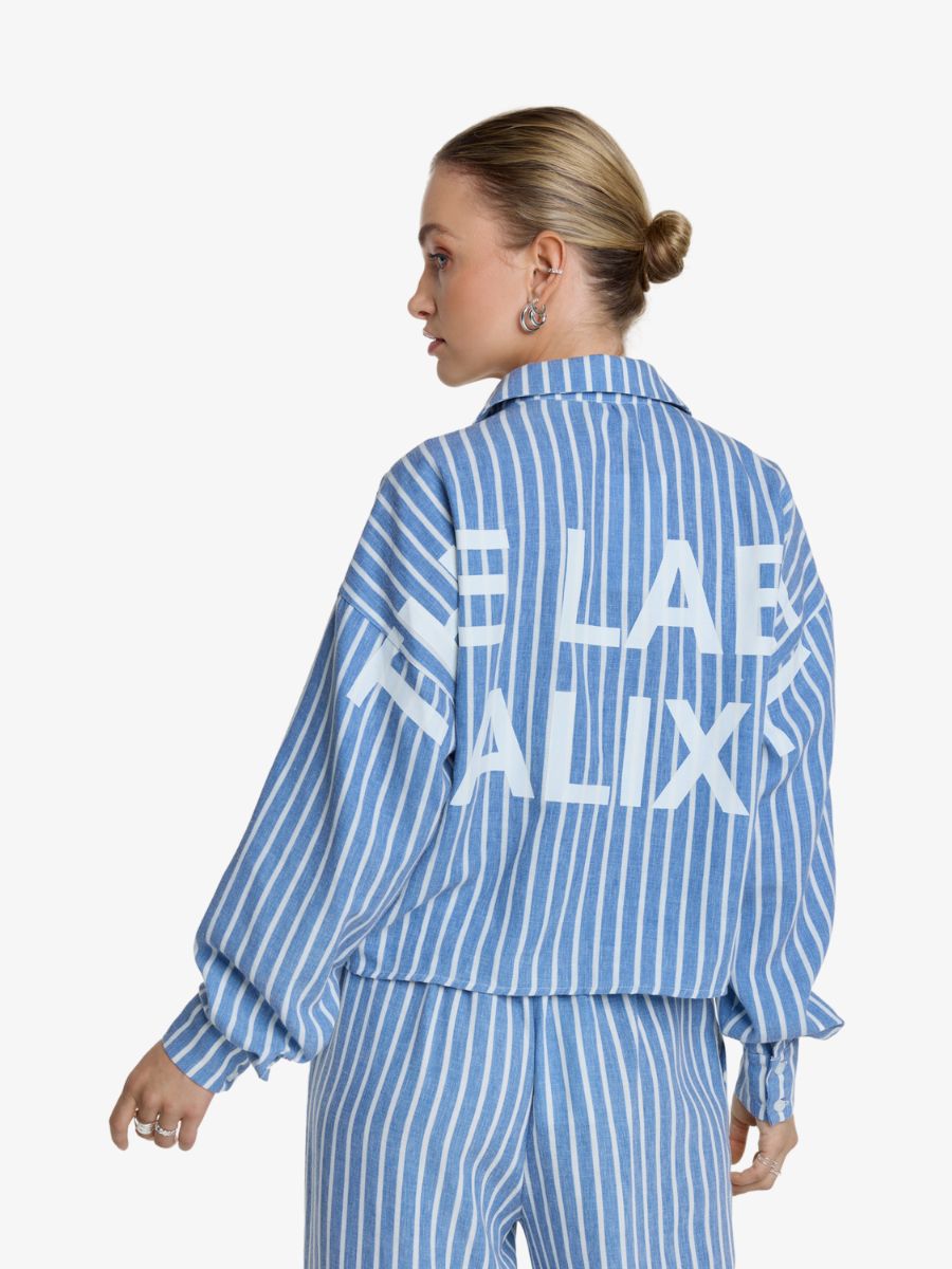 De Alix The Label Chambray Blouse in Denim Blue heeft een oversized cropped pasvorm, knoopsluiting en logo backprint. Combineer de blouse samen met de Alix The Label broek.