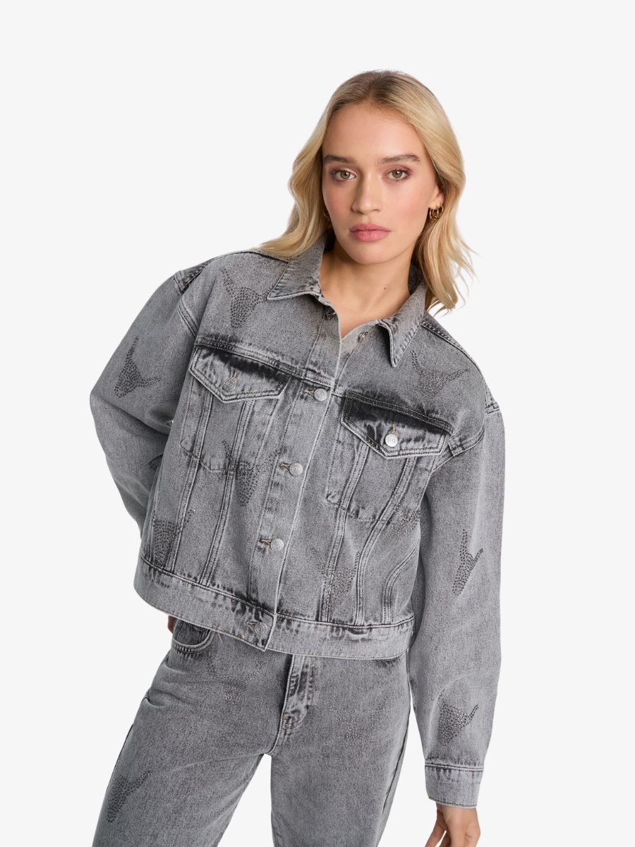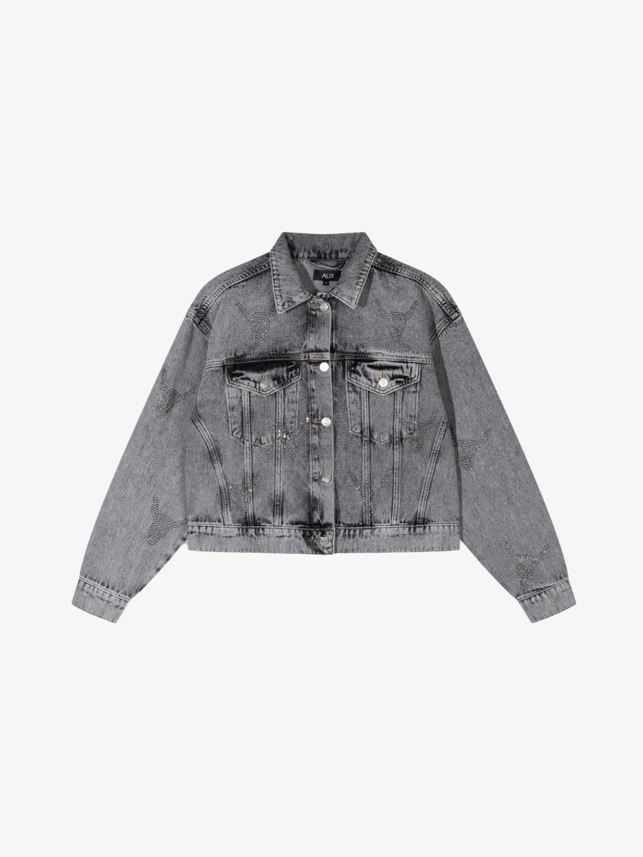 De Alix The Label Strass Bull Spijkerjas in Grey Washed Denim heeft een relaxed pasvorm. De spijkerjas heeft de Alix Bull in strass stenen en een knoopsluiting. Combineer de spijkerjas met de bijpassende Alix The Label Jeans.