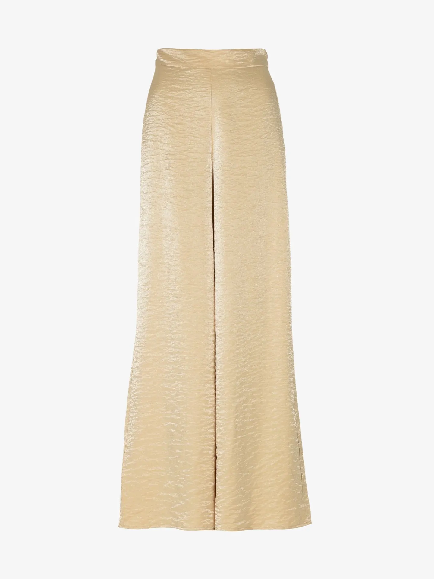 Deze elegante wijde broek is gemaakt van een luxe viscose twill kwaliteit met subtiele lurex details, wat zorgt voor een verfijnde en stijlvolle uitstraling. De elastische tailleband biedt optimaal draagcomfort en maakt de broek perfect voor zowel casual als geklede looks.