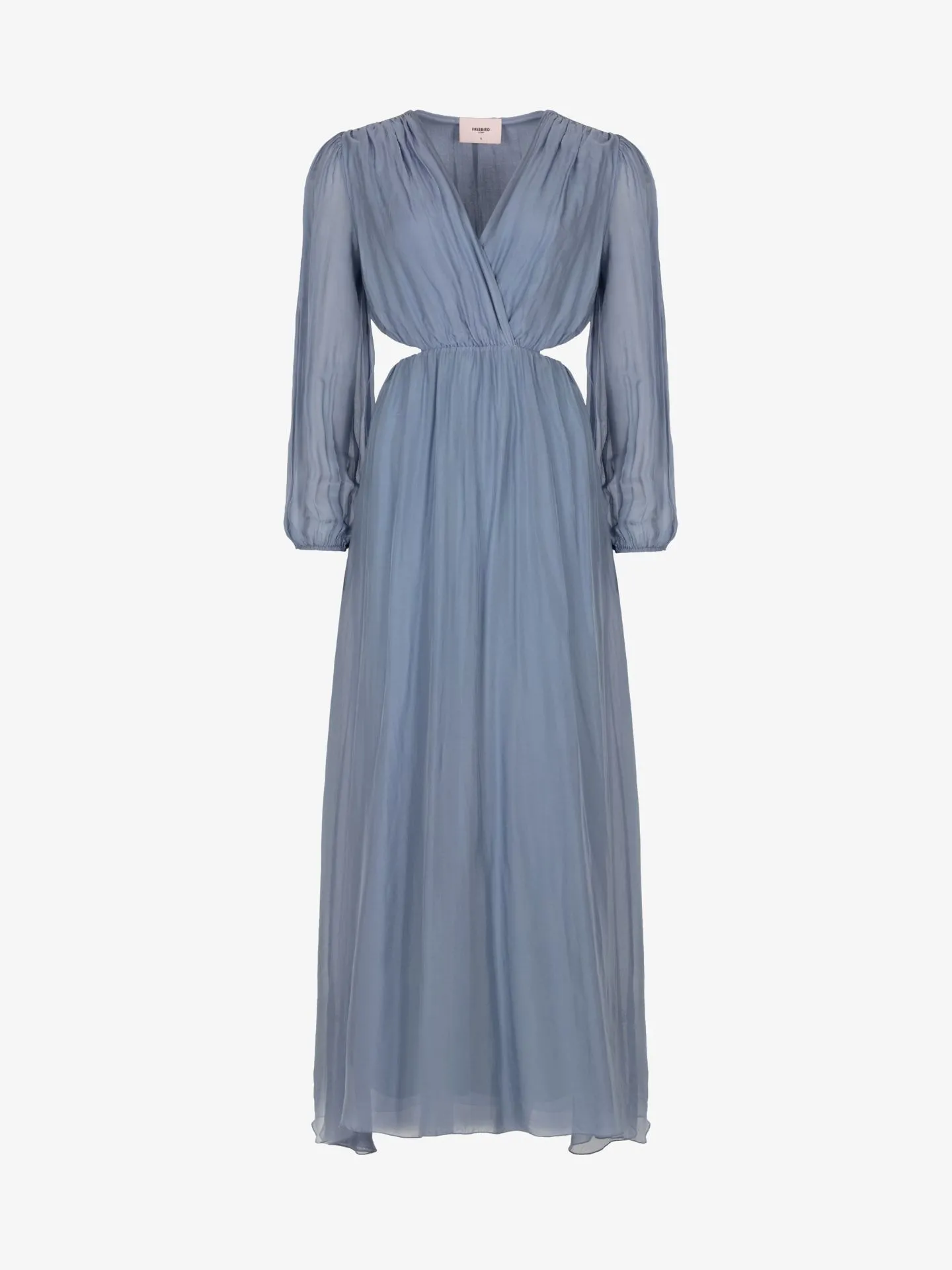 Deze blauwe maxi-jurk van het merk Freebird, model Diola, combineert een vloeiend silhouet met moderne details. Het is een maxi-jurk met een V-hals, lange transparante ballonmouwen en opvallende cut-outs (uitsnijdingen) aan de zijkanten van de taille.