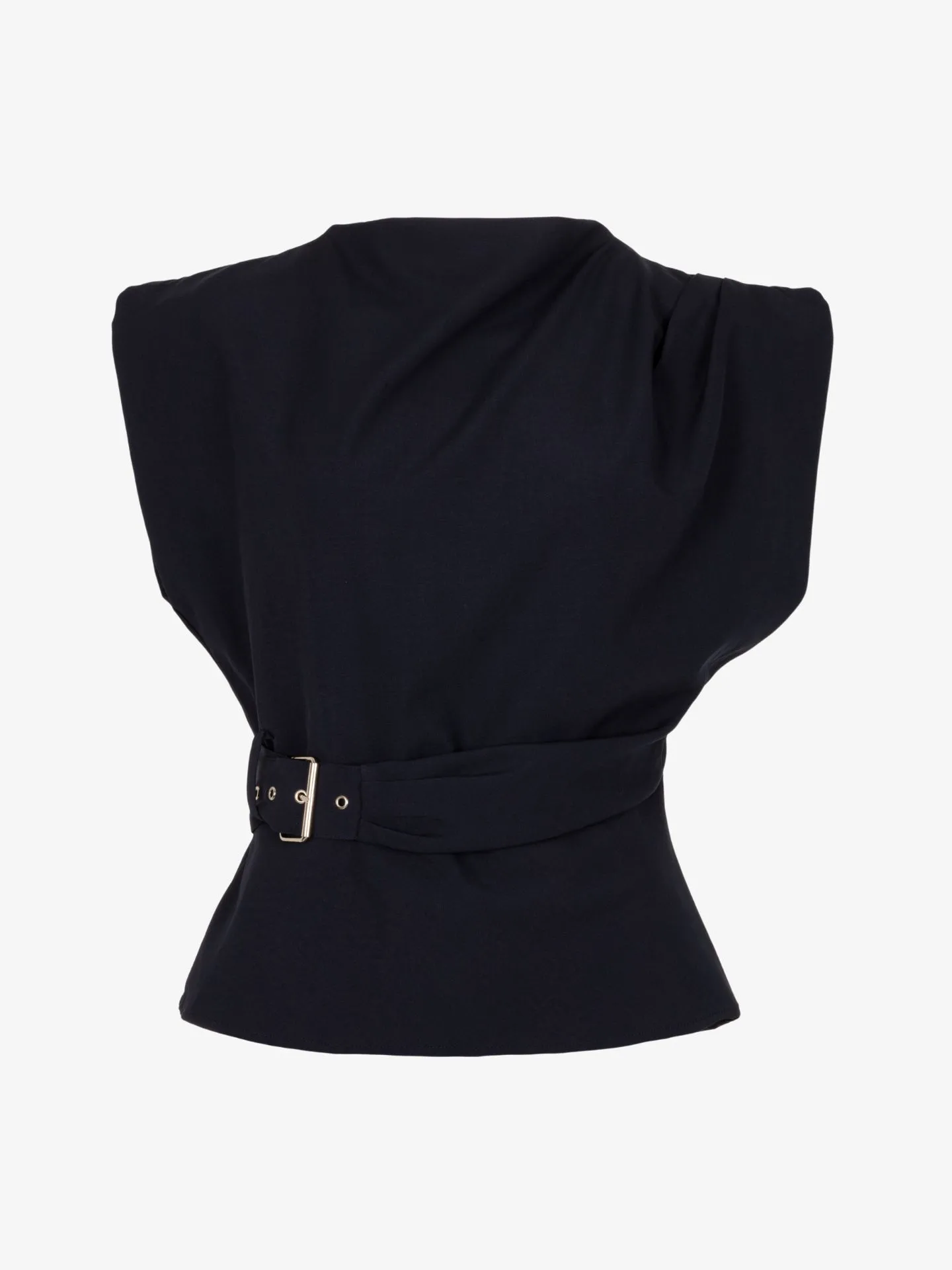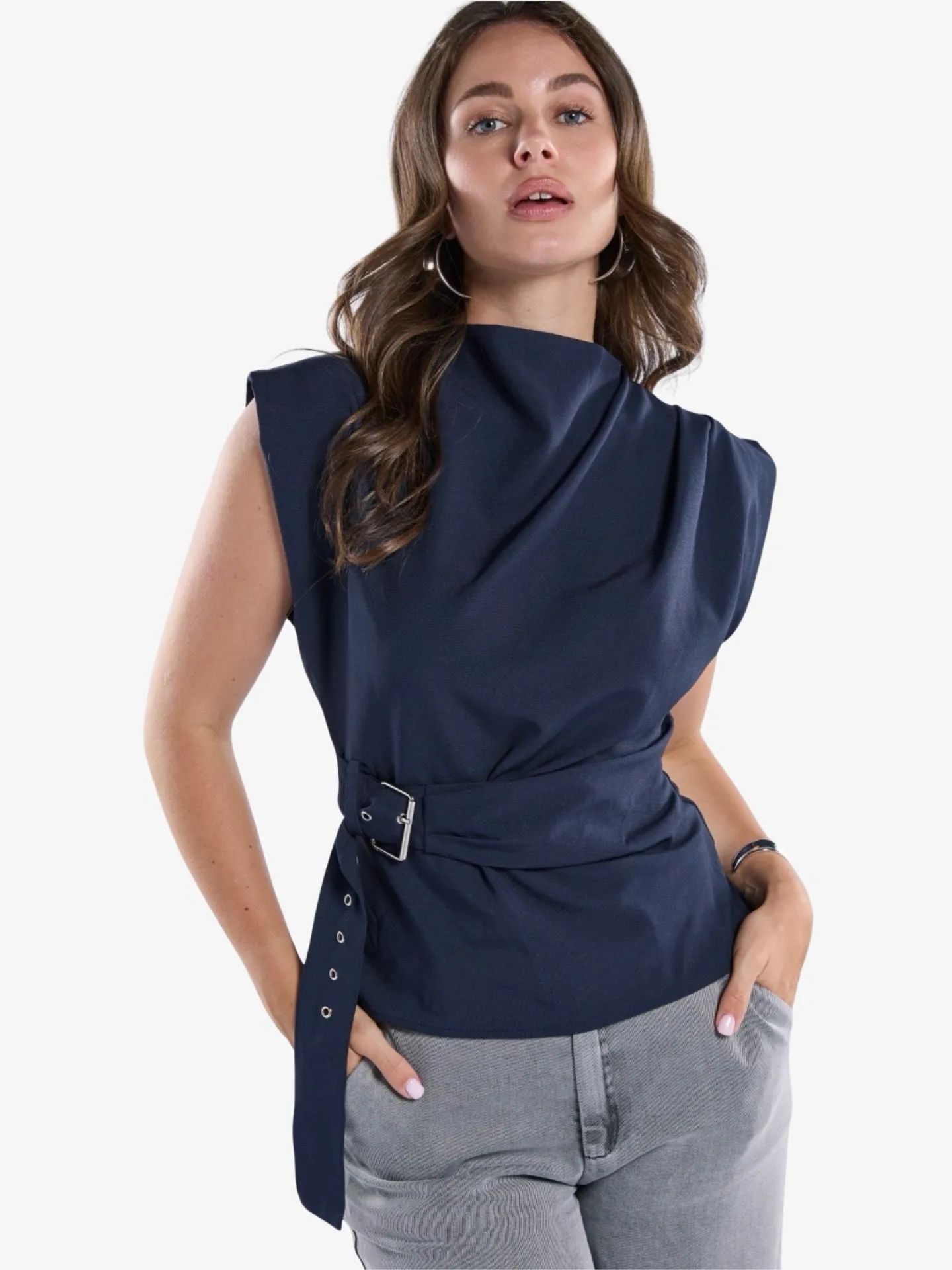 Deze chique top is uitgevoerd in een jersey kwaliteit zonder stretch en heeft een elegante, gestructureerde uitstraling. De subtiele schouderlijn en het asymmetrische ontwerp zorgen voor een moderne look, terwijl de buckle in de taille het silhouet mooi accentueert. Een verfijnd item dat perfect is voor een stijlvolle avondlook of een geklede gelegenheid.