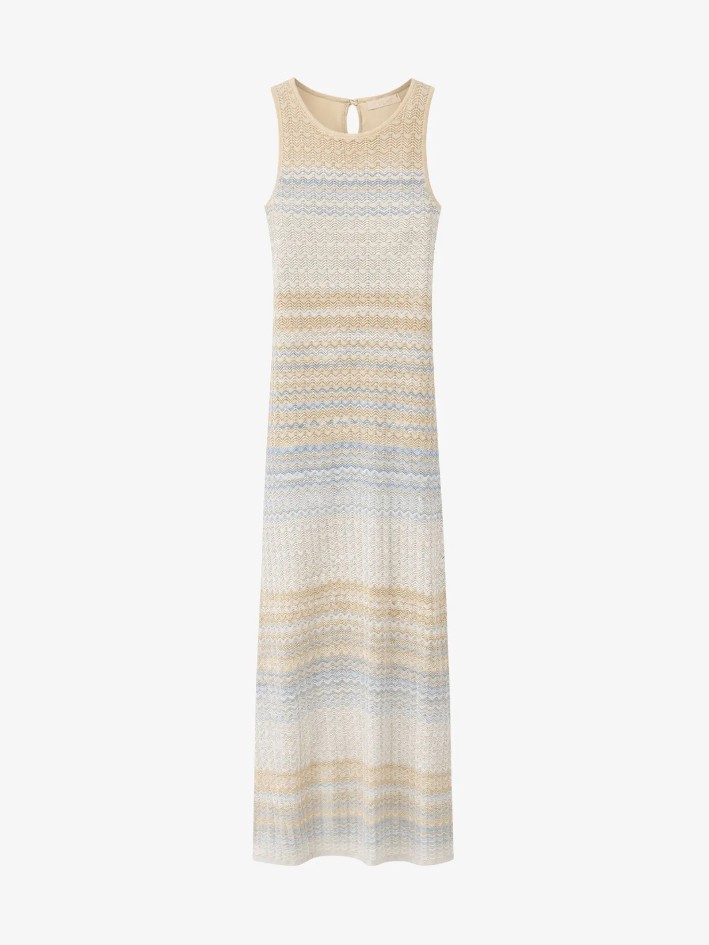 Stralende elegantie en zomers comfort komen samen in de Rosalyn Maxi Knit Dress van Guess. Deze prachtige lange jurk is uitgevoerd in een verfijnd zigzag-patroon (chevron) met zachte pasteltinten van lichtblauw, beige en creme. Dankzij de subtiele ingeweven gouden lurex-draad krijgt de jurk een luxueuze glans, waardoor het de perfecte keuze is voor zowel een zonnige vakantiedag als een chic zomerevenement. De jurk is vervaardigd uit een hoogwaardige, zachte viscosemix en heeft een flatterende slim-fit pasvorm die je silhouet prachtig volgt. Het mouwloze ontwerp met een klassieke ronde halslijn en een verfijnde keyhole-sluiting aan de achterzijde zorgt voor een luchtige en vrouwelijke uitstraling. De ajour-gebreide structuur geeft de jurk een ambachtelijke, high-end look die direct in het oog springt. Maak de set compleet: Voor een gelaagde en harmonieuze look combineer je deze maxi-jurk perfect met de bijpassende Rosalyn Knit Cardigan. Samen vormen ze een stijlvol geheel dat ideaal is voor de overgang van een warme middag naar een koelere avond.