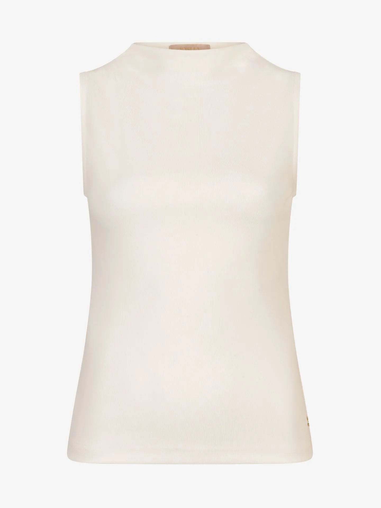 De JOSH V Bibi dames top in de kleur Creme White is een klassieke en tijdloze basic. Het mouwloze topje is uitgevoerd in een jersey kwaliteit met gerecycled polyester, stretch en katoen, ingekocht via het Better Cotton Initiative. De top met hoge halslijn heeft een slim fit pasvorm. Aan de achterzijde is het cremekleurige topje afgewerkt met een geborduurd JOSH V logo. Combineer het topje met een plisserok en loafers voor een elegante, vrouwelijke look met een moderne twist.