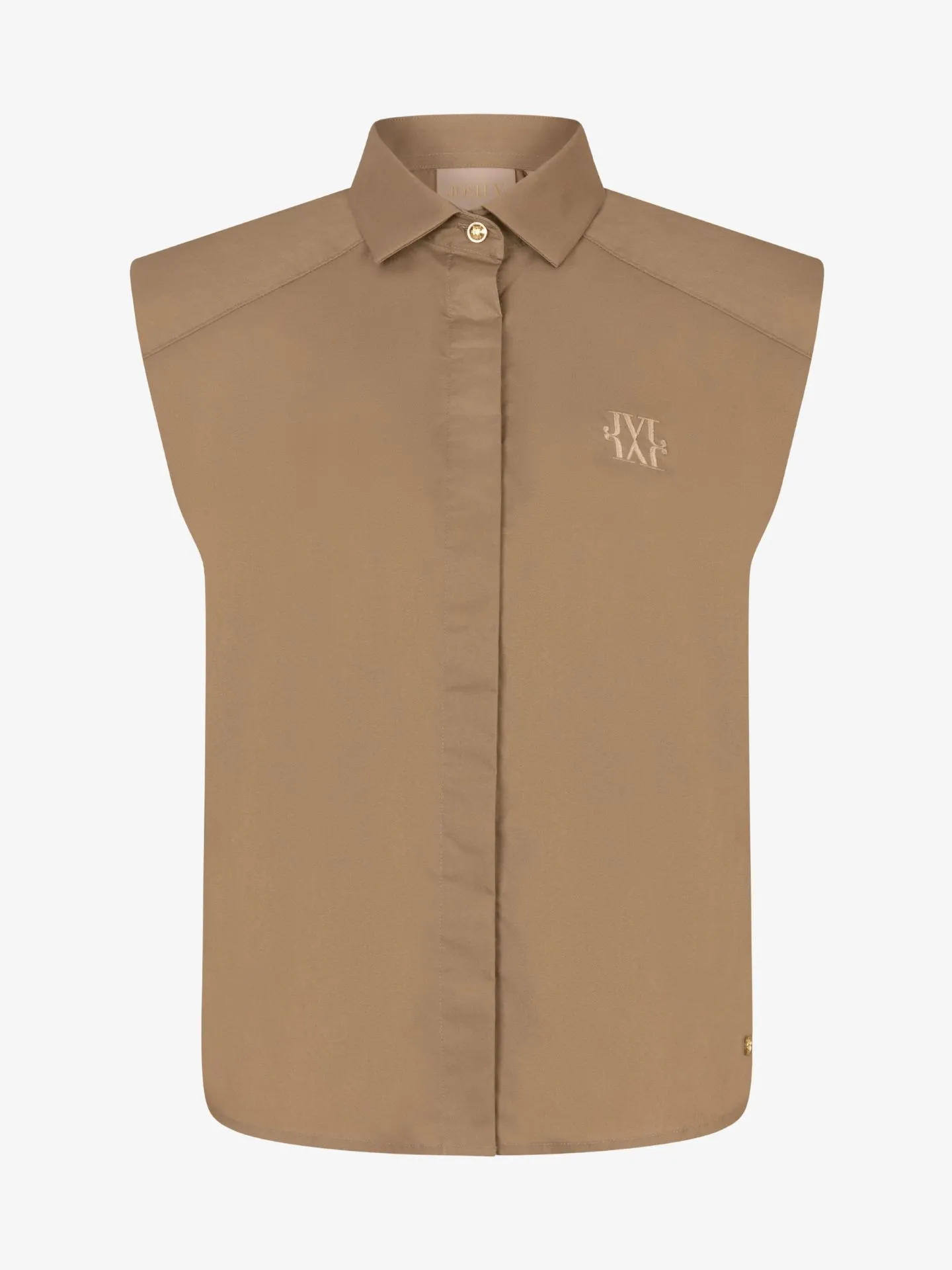 De JOSH V Susie dames blouse in de kleur Light Khaki is een mouwloze blouse met een straight fit en een klassieke kraag. De knoopsluiting aan de voorzijde en het subtiele logo borduursel op de borst maken het ontwerp uniek. De mouwloze blouse is Ideaal voor warme dagen of een gelaagde looks. Combineer de Susie blouse met de bijpassende Tarrant rok voor een complete set of draag op een jeans voor een casual look.
