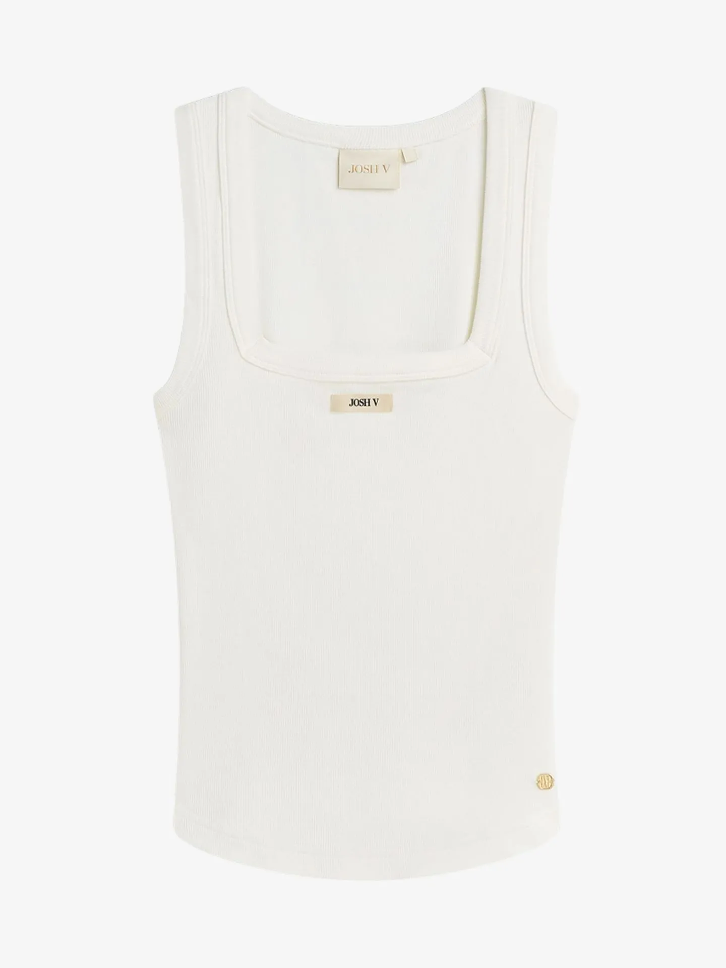 De JOSH V Dieda dames top in de kleur Off White is een slim fit tanktop met een vierkante hals. De mouwloze top is gemaakt van katoen, ingekocht via het Better Cotton Initiative en stretch voor extra comfort. Het witte logodetail aan de voorkant zorgt voor een subtiel accent. Combineer de top met een high waisted rok en sandalen voor een frisse lente- of zomerlook, of draag onder een oversized blazer met slingbacks voor een stijlvolle, moderne uitstraling.