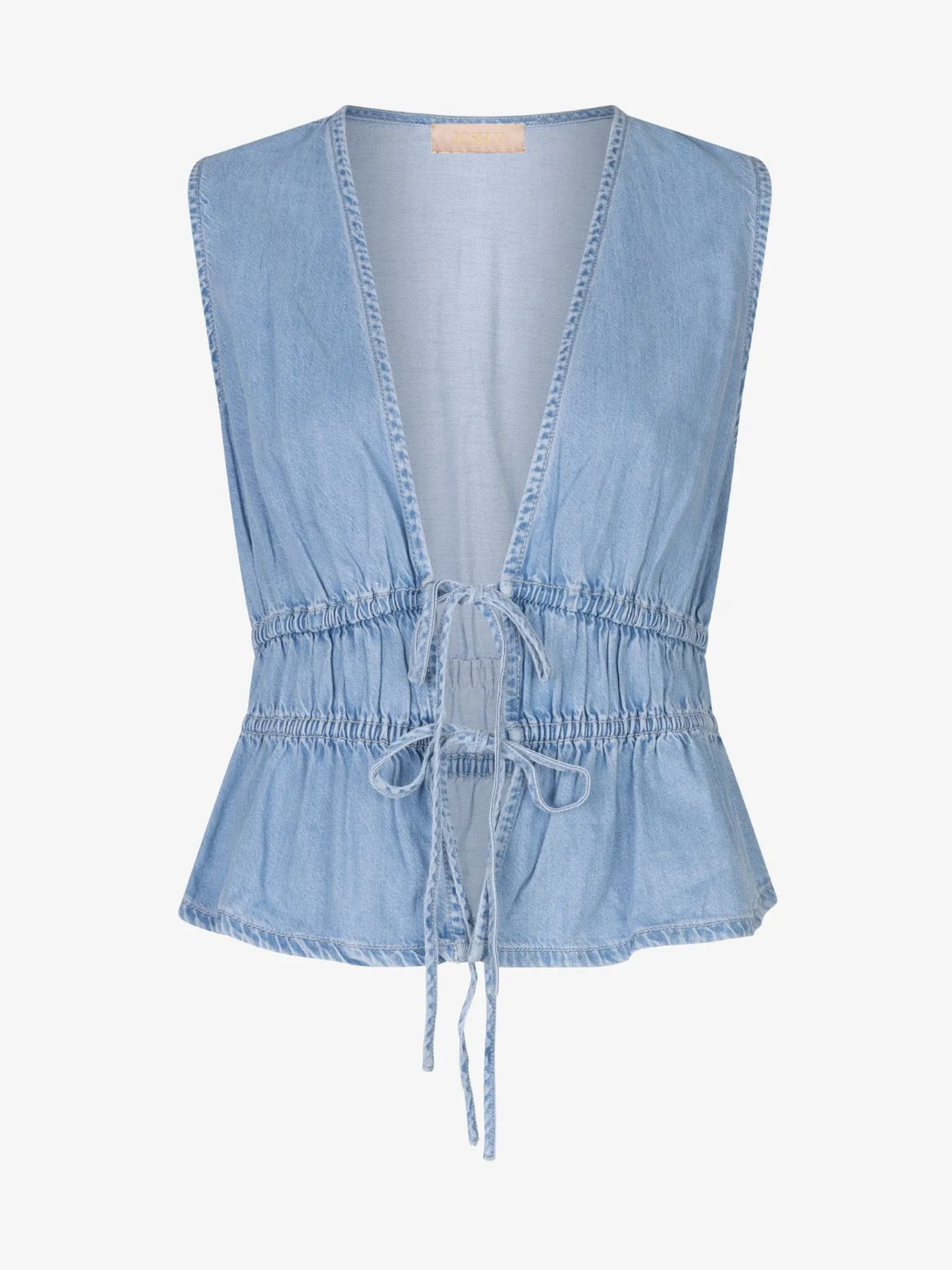 De JOSH V Sea dames top in de kleur Mid Blue Denim is een getailleerde denim top, gemaakt van katoen ingekocht via het Better Cotton Initiative (BCI). Het denim gilet is voorzien van twee treksluitingen waarmee je taille creeert. De blauwe top is onderdeel van een compleet pak en combineer je perfect met de Sera broek, maar ook draag je de top perfect in combinatie met een witte broek.