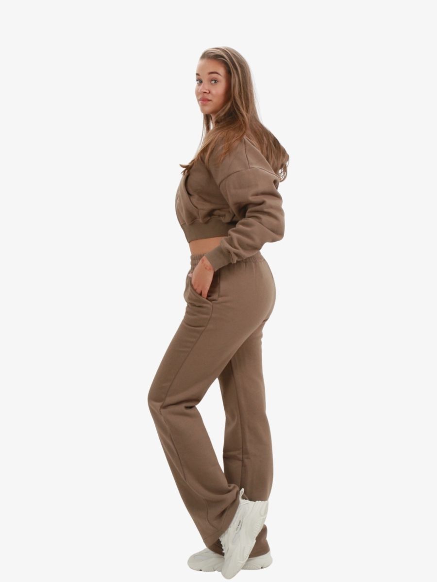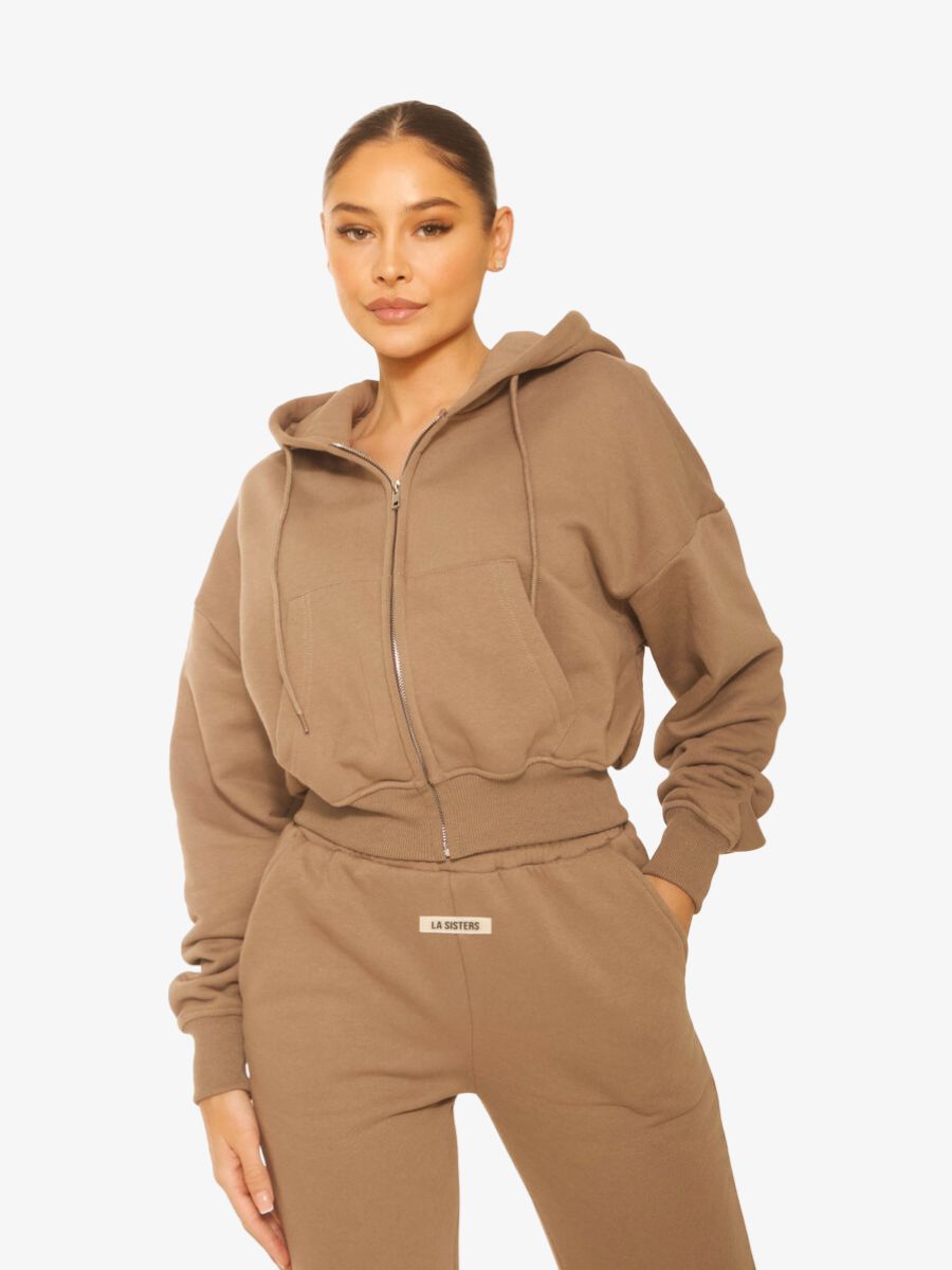 De LA Sisters Essential Cropped Hoodie in de kleur taupe heeft een cropped pasvorm. Het vest heeft een fleecevoering. Combineer het vest samen met de bijpassende LA Sisters broek.