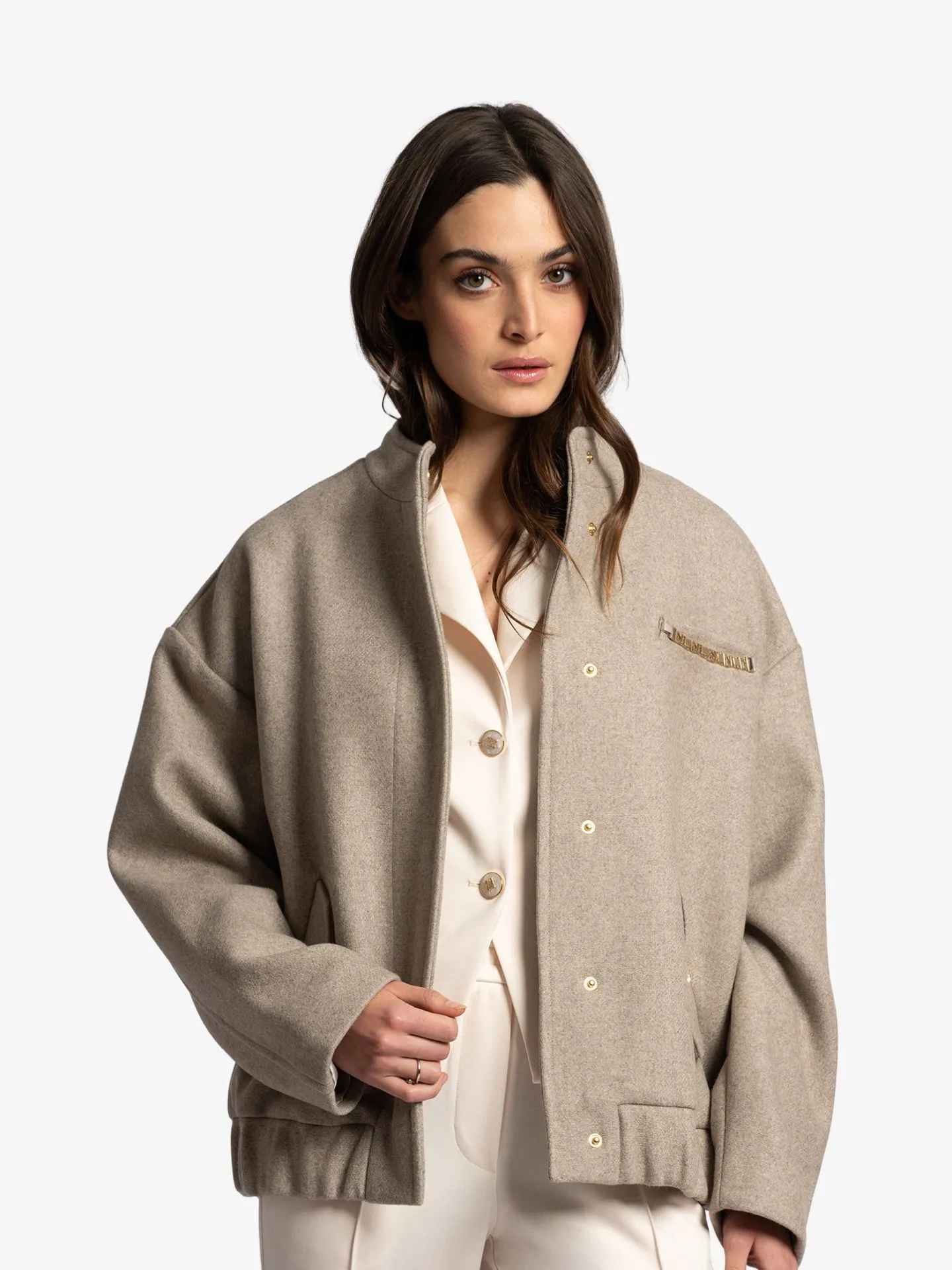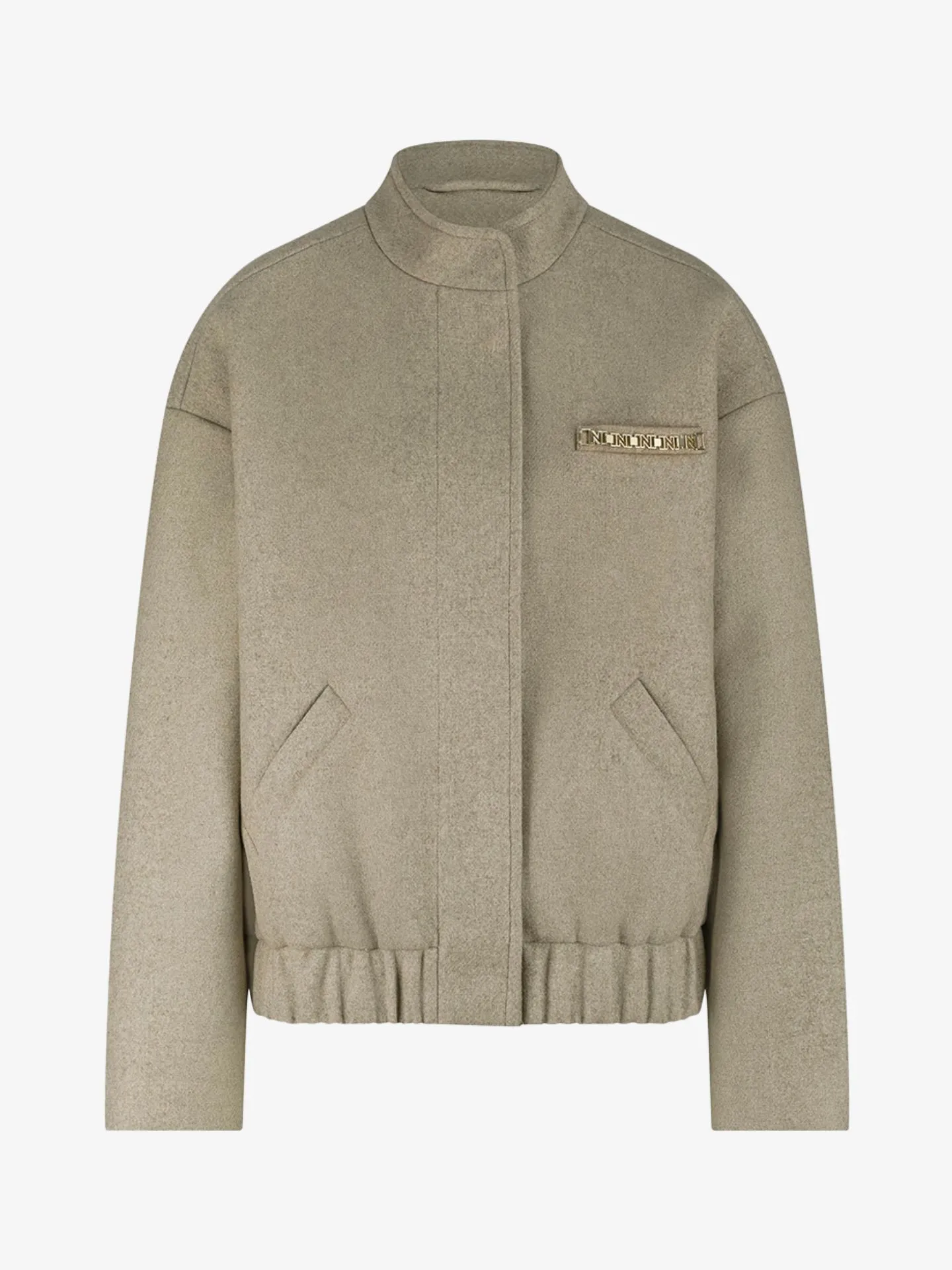 Oversized bomberjack van het merk Nikkie de jas gemaakt van een wolmix heeft een elastische tailleband, een drukknoopsluiting en een ketting detail. De jas is voorzien van zakken en een hoge hals.