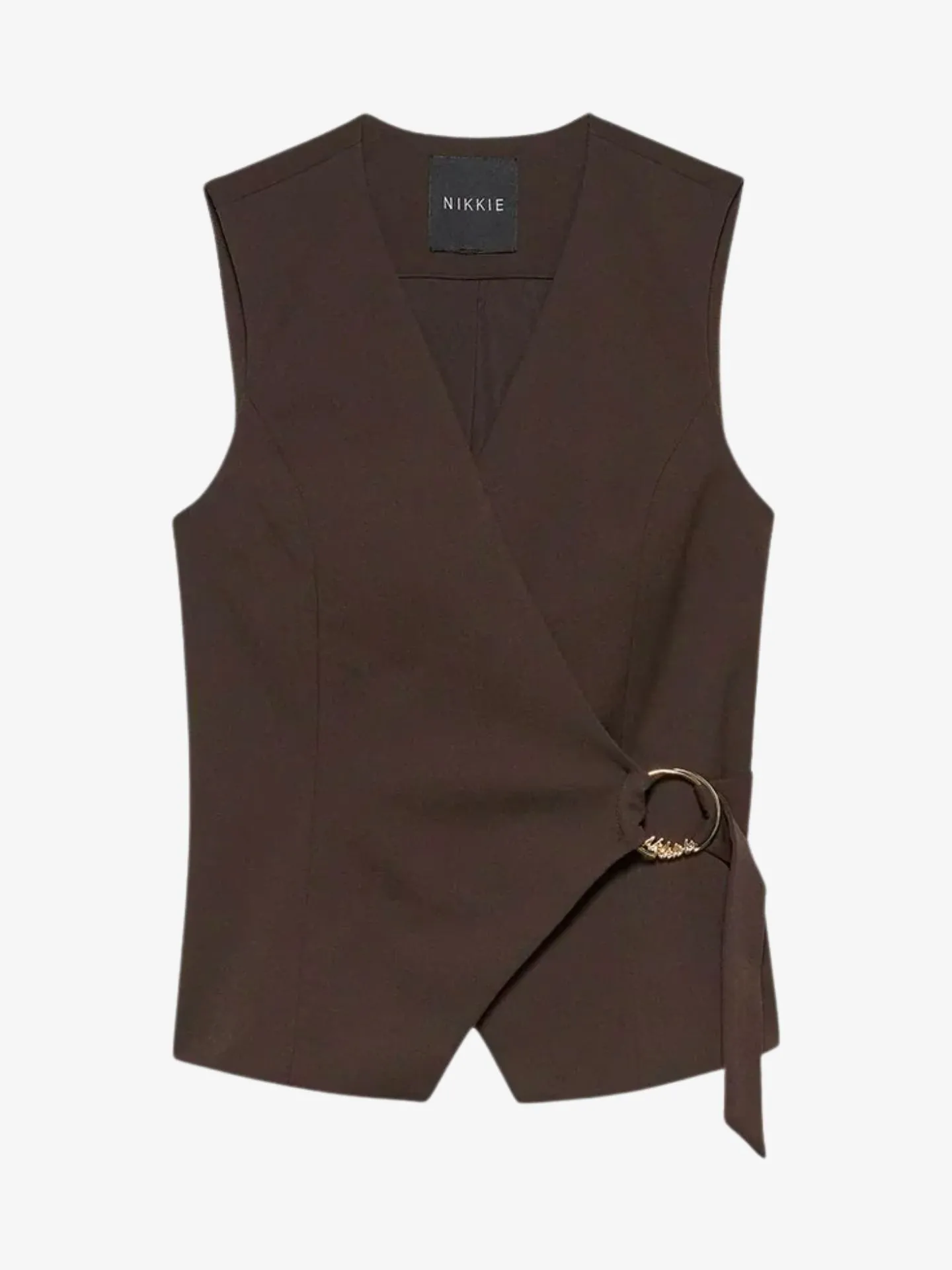 Mouwloos gilet met een V-hals, een drukknoopsluiting en een logo gesp detail. Het gilet heeft een aansluitende pasvorm. • Mouwloos gilet • Logo gesp detail • Patroon: Effen • Kraag: V-hals • Sluiting: Knoop • Pasvorm: getailleerd