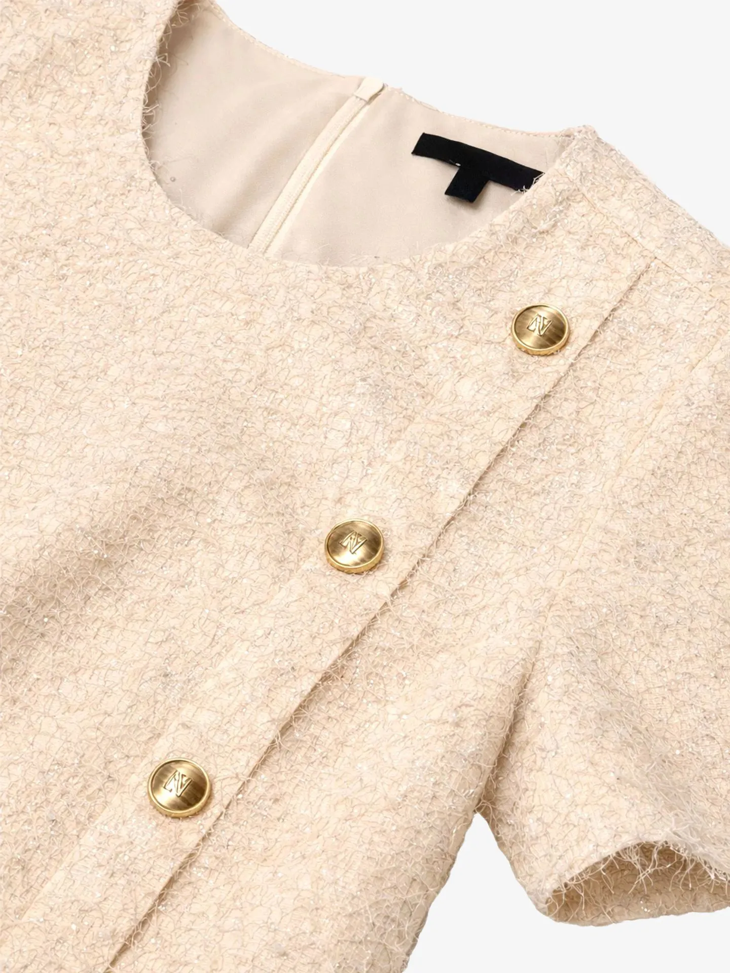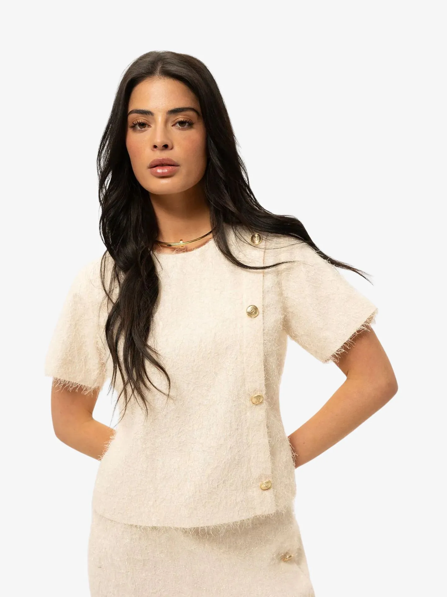 Deze fluffy top met subtiele glitters heeft een ronde hals en is afgewerkt met decoratieve knopen voor een speelse en stijlvolle touch. De blinde ritssluiting zorgt voor een strakke afwerking, terwijl de wijde, boxy pasvorm zorgt voor een comfortabele en trendy uitstraling.