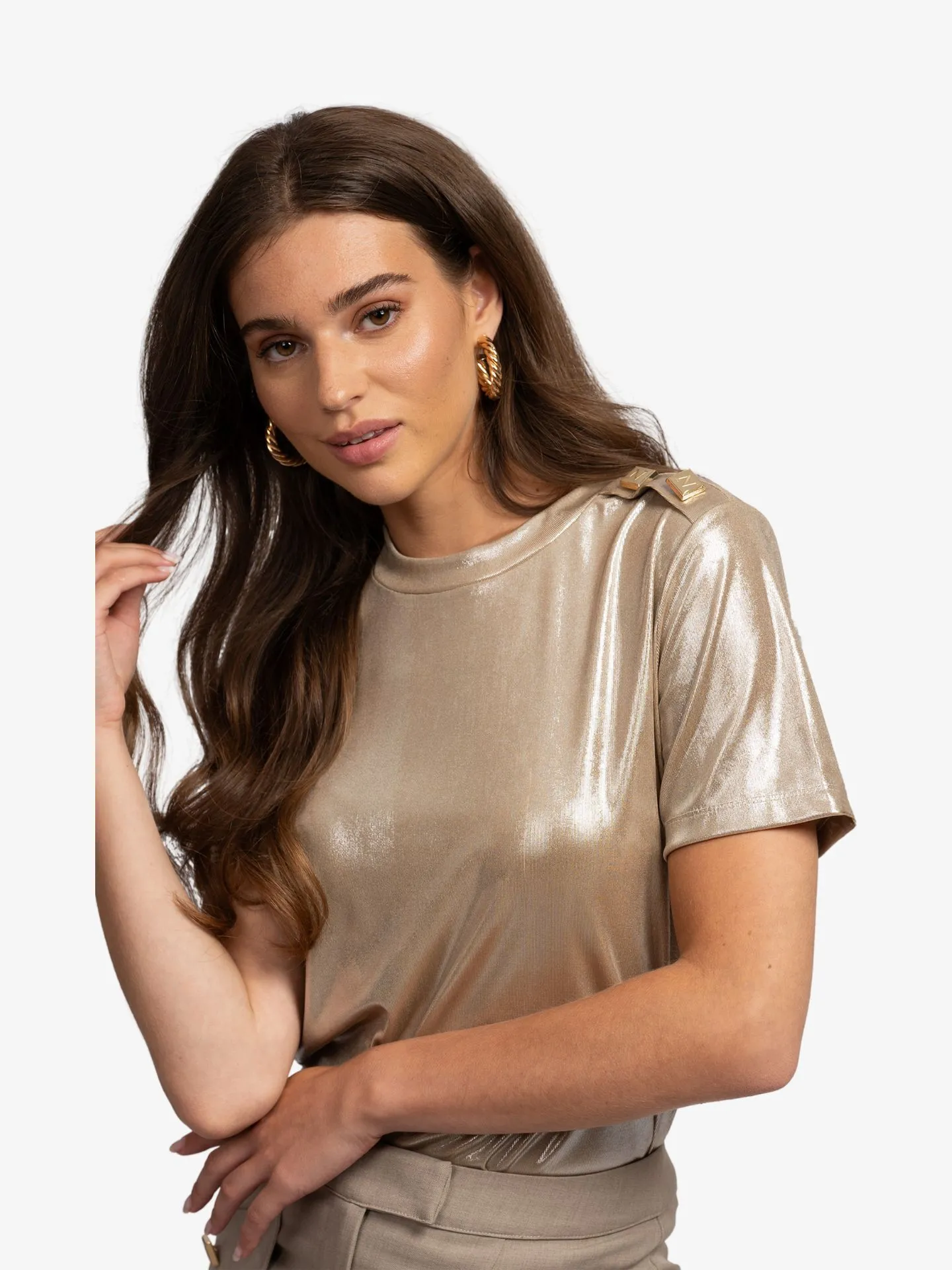 Metallic look T-shirt met een ronde hals, decoratieve knopen op de schouder en een normale pasvorm. Combineer samen met een mooie pantalon uit de collectie.