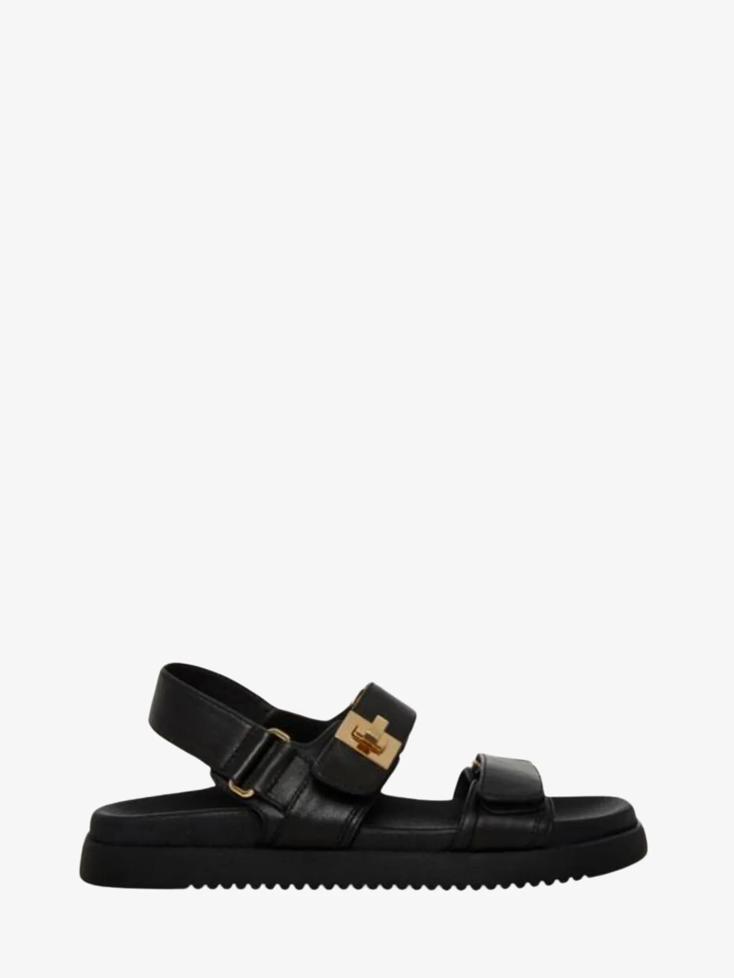 De Steve Madden sandalen MONA neemt het klassieke driebandsandaalontwerp met een voorgevormd voetbed en een platte zool en verheft het met substantiele goudkleurige hardware. Kleur : BLACK LEATHER