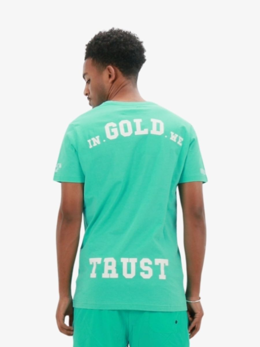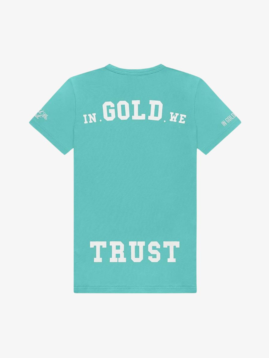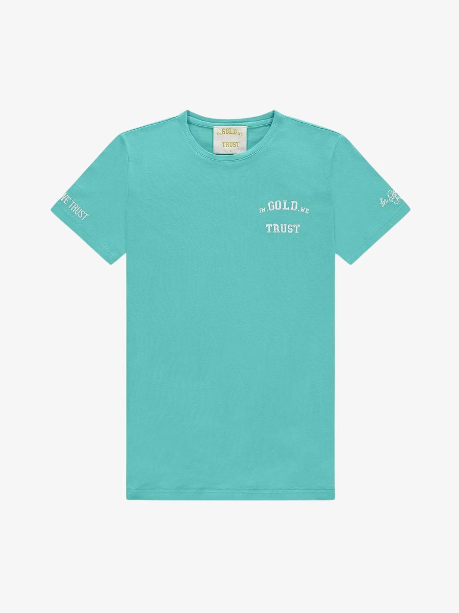De In Gold We Trust The Pusha is een t-shirt in de kleur turquoise met een backprint in wit en geborduurd logo op de mouwen. Het shirt heeft een slim fit. Combineer het IGWT t-shirt samen met de IGWT zwembroek.