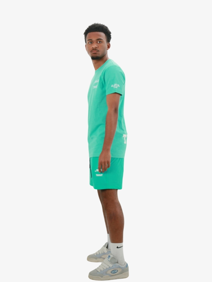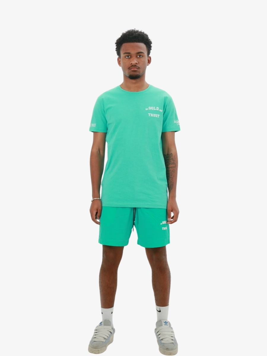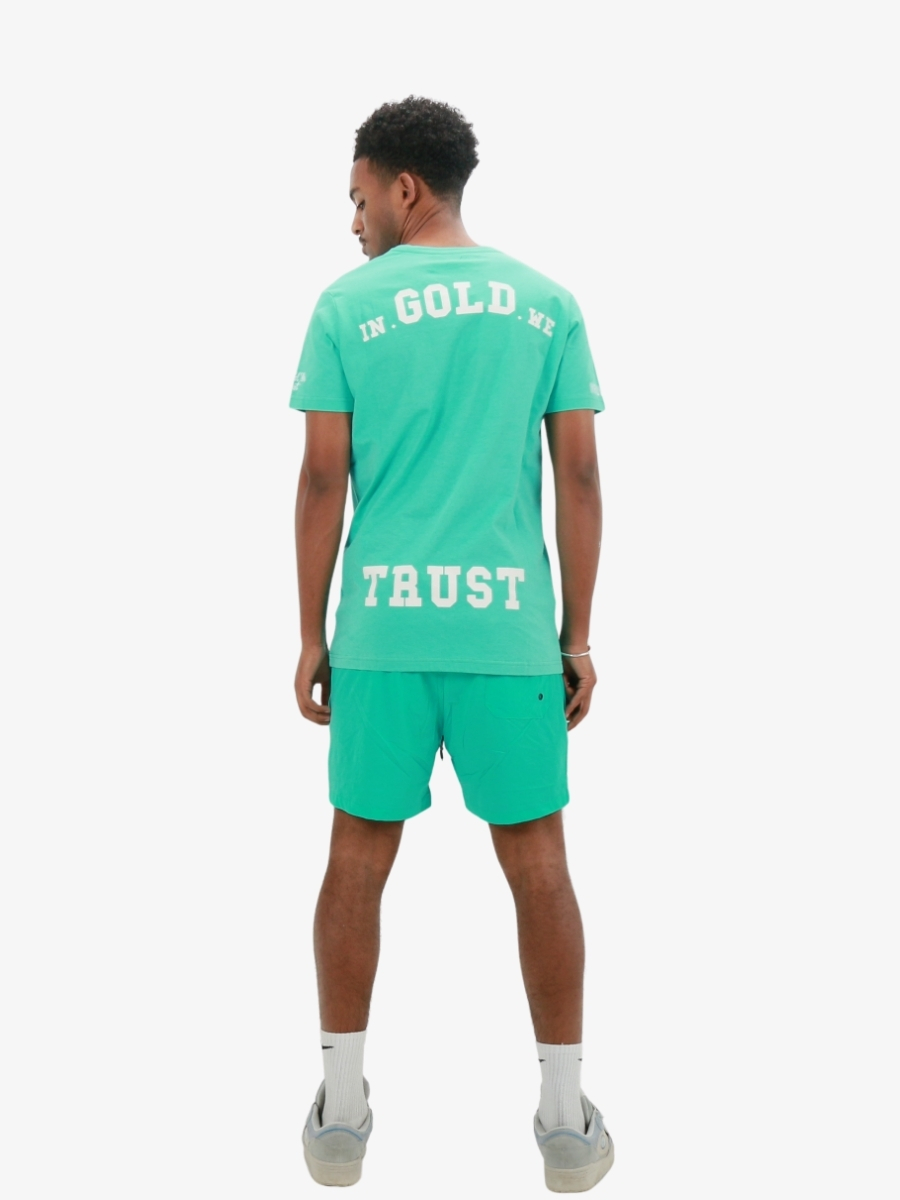De In Gold We Trust The Pusha is een t-shirt in de kleur turquoise met een backprint in wit en geborduurd logo op de mouwen. Het shirt heeft een slim fit. Combineer het IGWT t-shirt samen met de IGWT zwembroek.