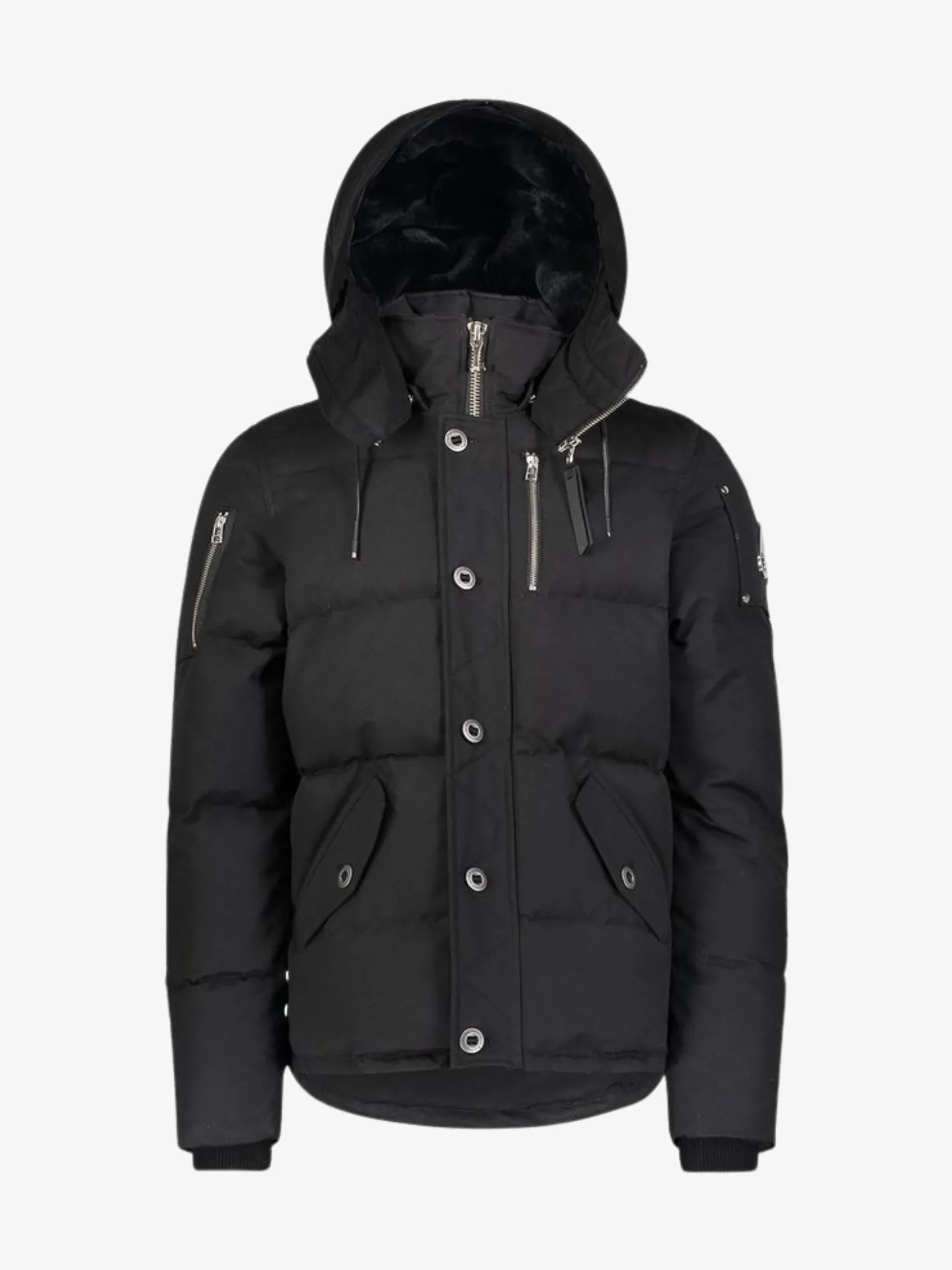 De zwarte Forrestville 4 winterjas van het Canadese merk Moose Knuckles heeft een afneembare capuchon, rits- en knoopsluiting, logo op de linkermouw, steekzakken en elastische boorden. De jas heeft een stugge kwaliteit.