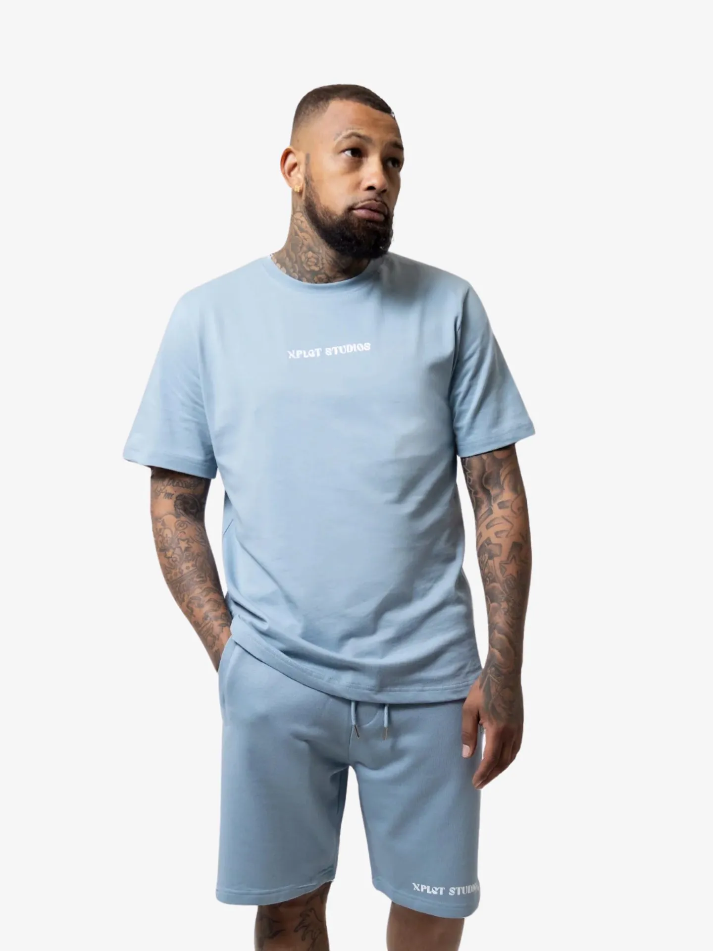 De Xplct tweedelige L.i.g. set in de kleur Arona Blue bestaat uit een t-shirt met een backprint in het wit met het logo en palmbomen en een bijpassnde short.
