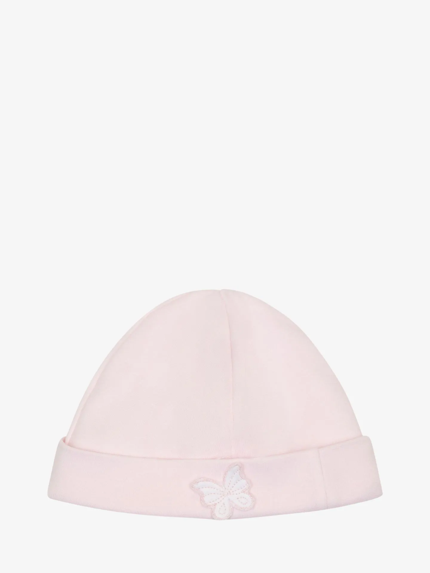 Katoenen muts van het merk Baby Gi. De zachte muts in de kleur roze heeft een vlinder applicatie aan de voorzijde. Combineer de muts met het bijpassende boxpakje voor een complete look.