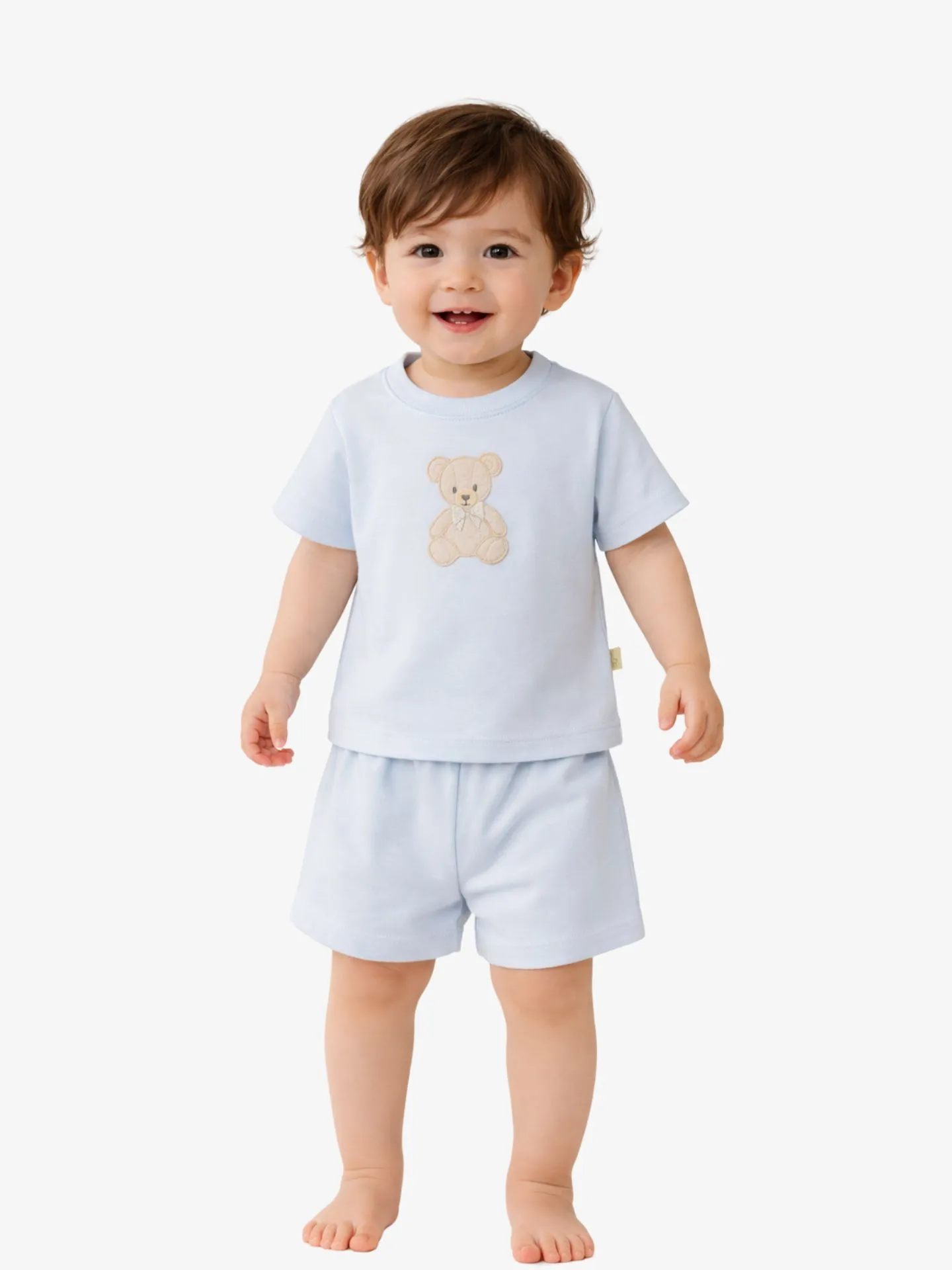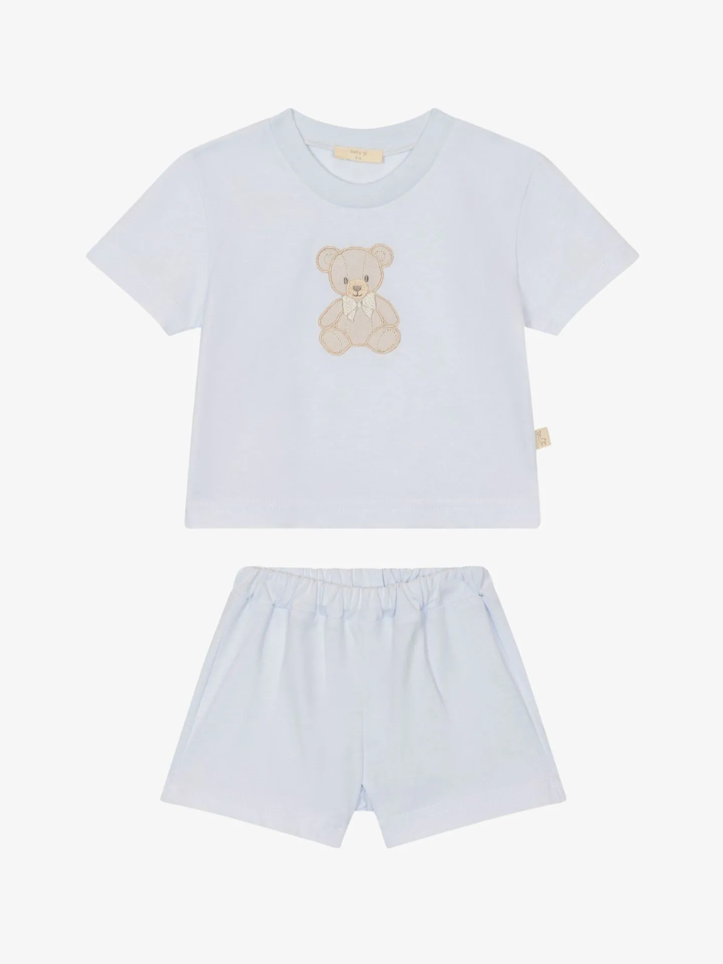 Dit charmante tweedelige setje van Baby Gi biedt de perfecte combinatie van comfort en stijl voor jouw kleintje. Uitgevoerd in een frisse lichtblauwe kleur, is het een ideale keuze voor een zomerse dag of als zachte pyjama. Materiaal: Deze variant is gemaakt van 100% zacht katoen-jersey dat comfortabel aanvoelt op de babyhuid. Design Top: Het lichtblauwe T-shirt heeft korte mouwtjes en is versierd met een geborduurde beige teddybeer op de borst, compleet met een klein strikje. Design Broekje: Het bijpassende shortje in dezelfde blauwe tint heeft een comfortabele elastische tailleband.