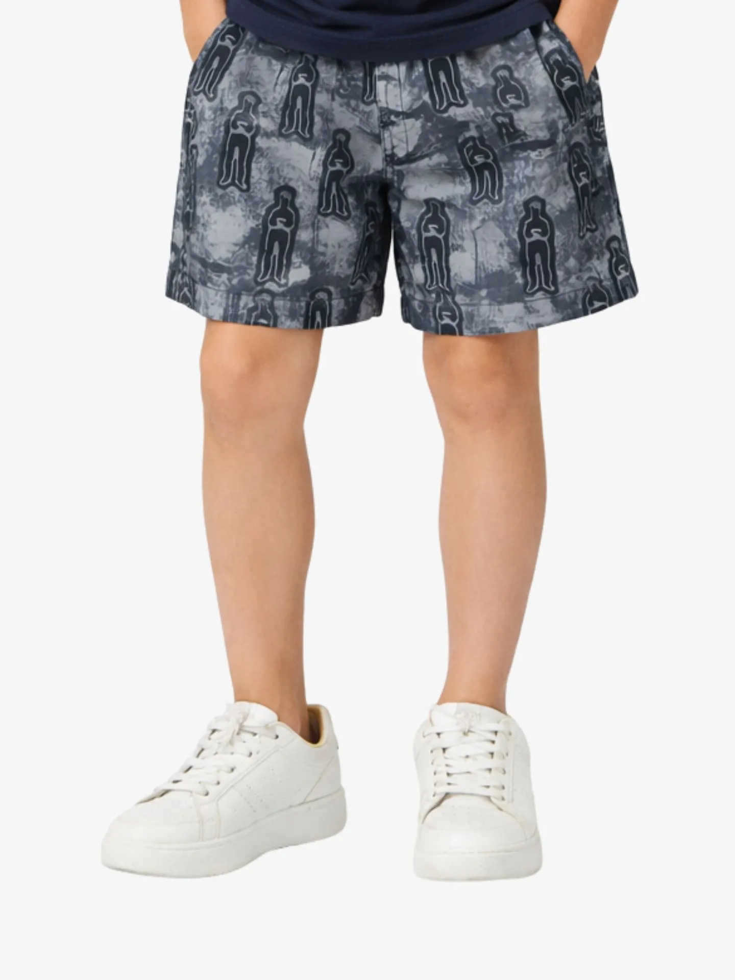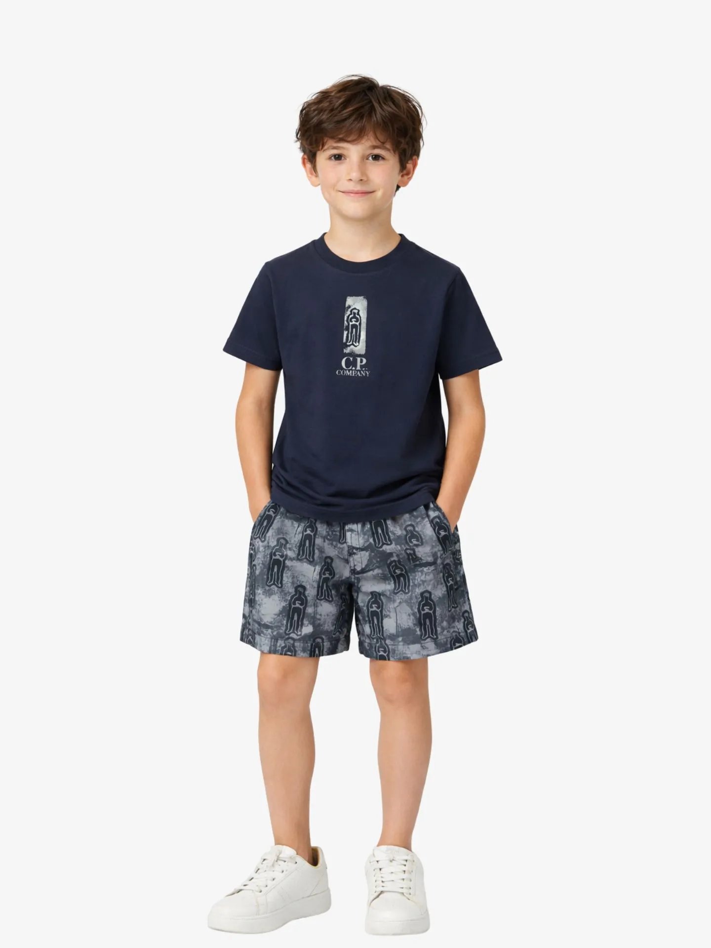 Zwembroek van het Italiaanse merk CP Company. De zwembroek in de kleur Navy heeft een elastische tailleband met aantrekkoordjes en een all-over print.