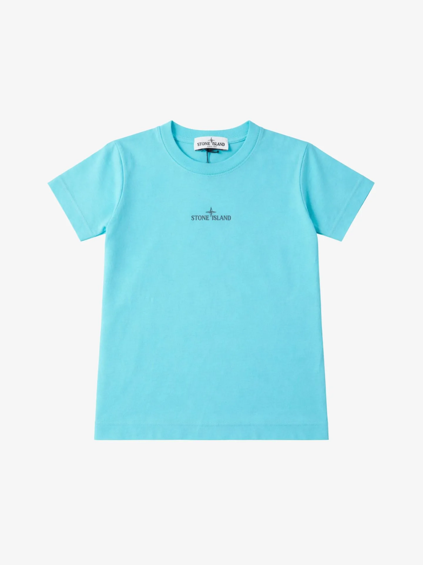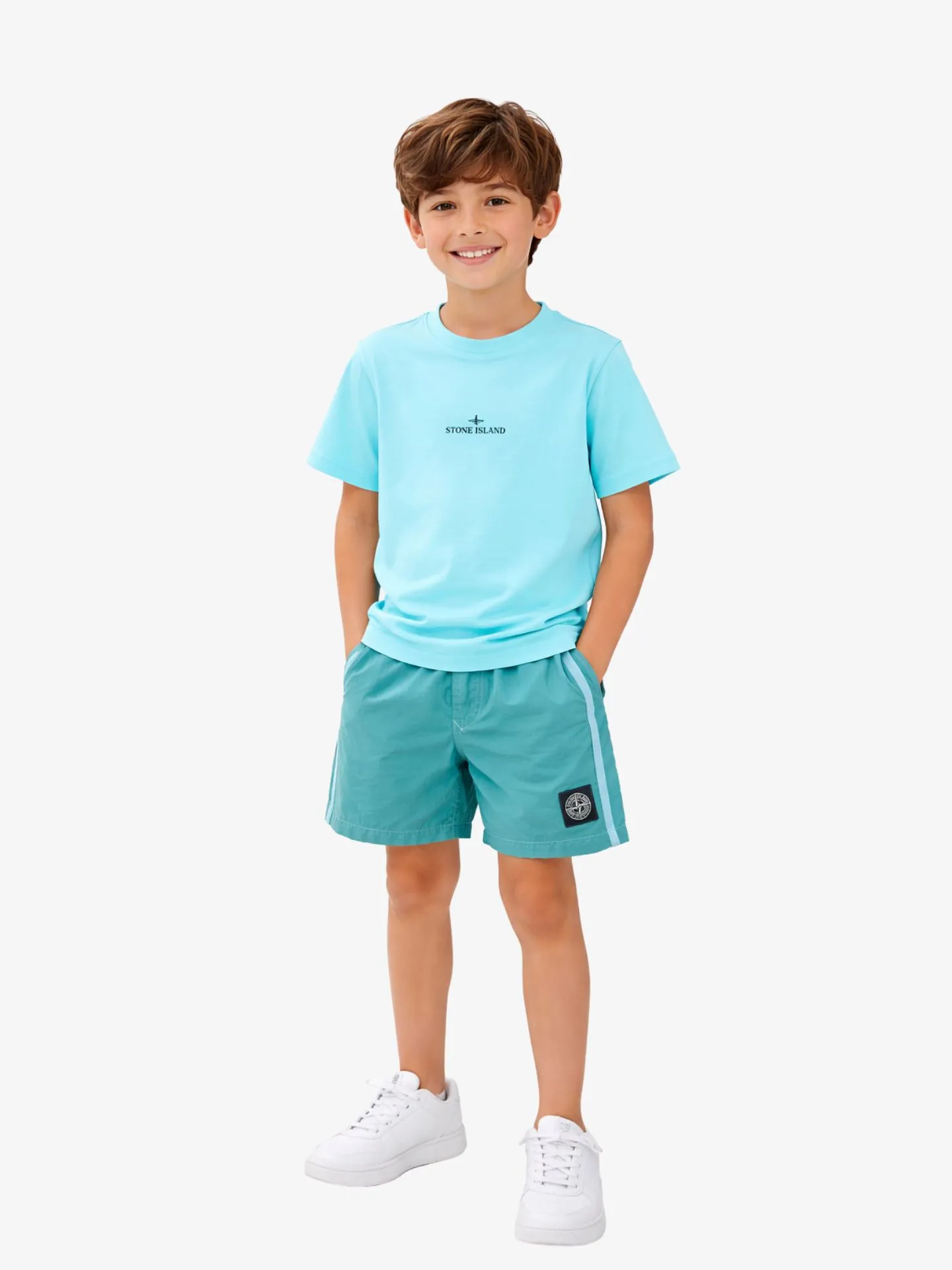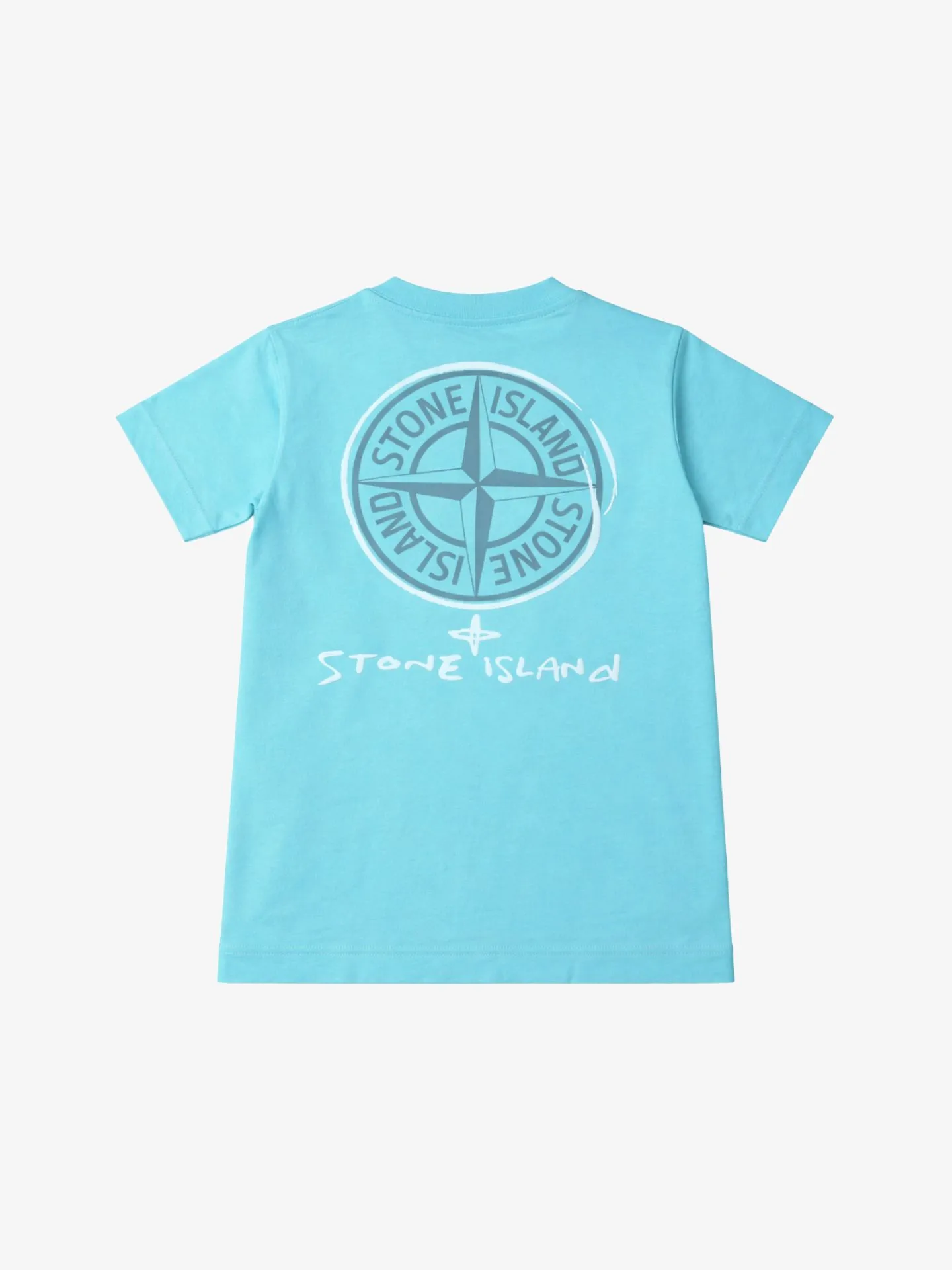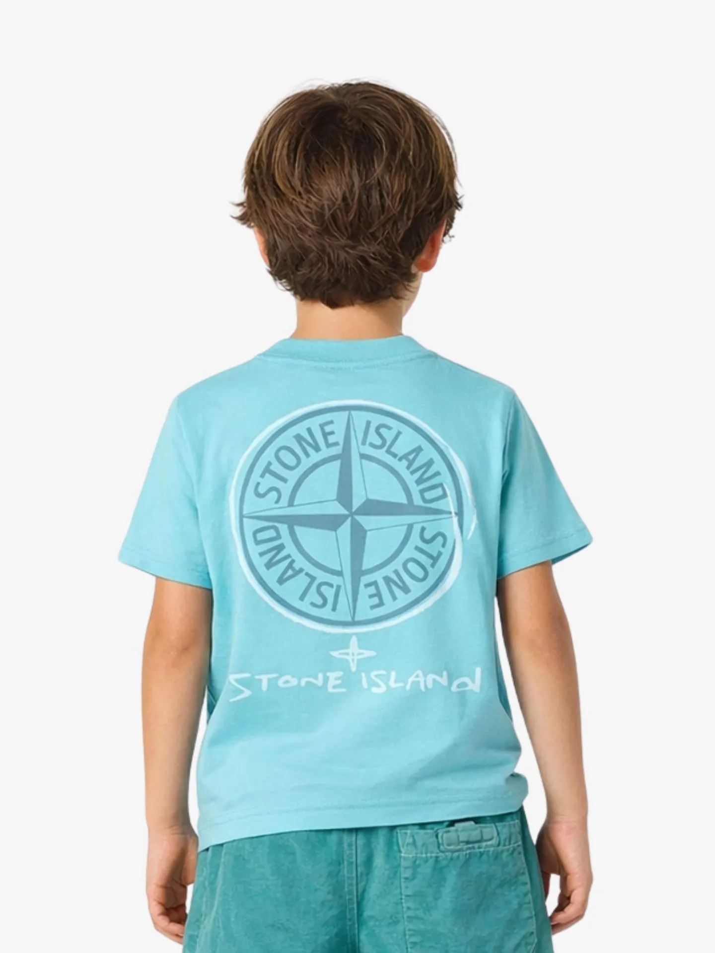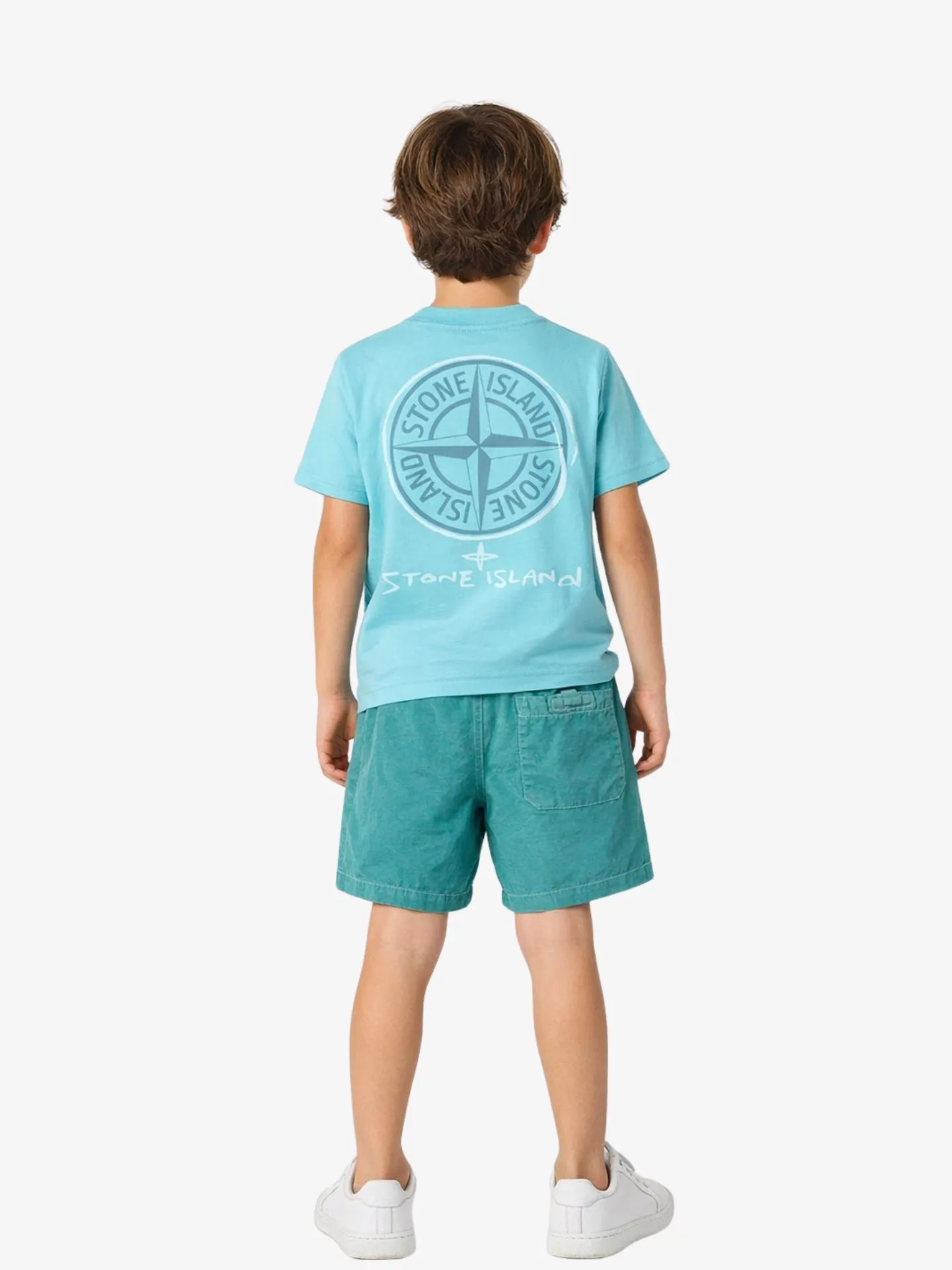 Dit is een fris en herkenbaar Stone Island Junior T-shirt, uitgevoerd in aqua blauw en vervaardigd uit zacht, hoogwaardig katoen voor optimaal dagelijks comfort. Terwijl de voorzijde een subtiele, centrale logoprint toont, wordt de achterzijde gekenmerkt door een opvallende, grote grafische print van het Construction Lines motief waarin het iconische kompas-logo op artistieke wijze is verwerkt. Dankzij de relaxte pasvorm en het duurzame biologische katoen is dit item een veelzijdige toevoeging aan een moderne garderobe
