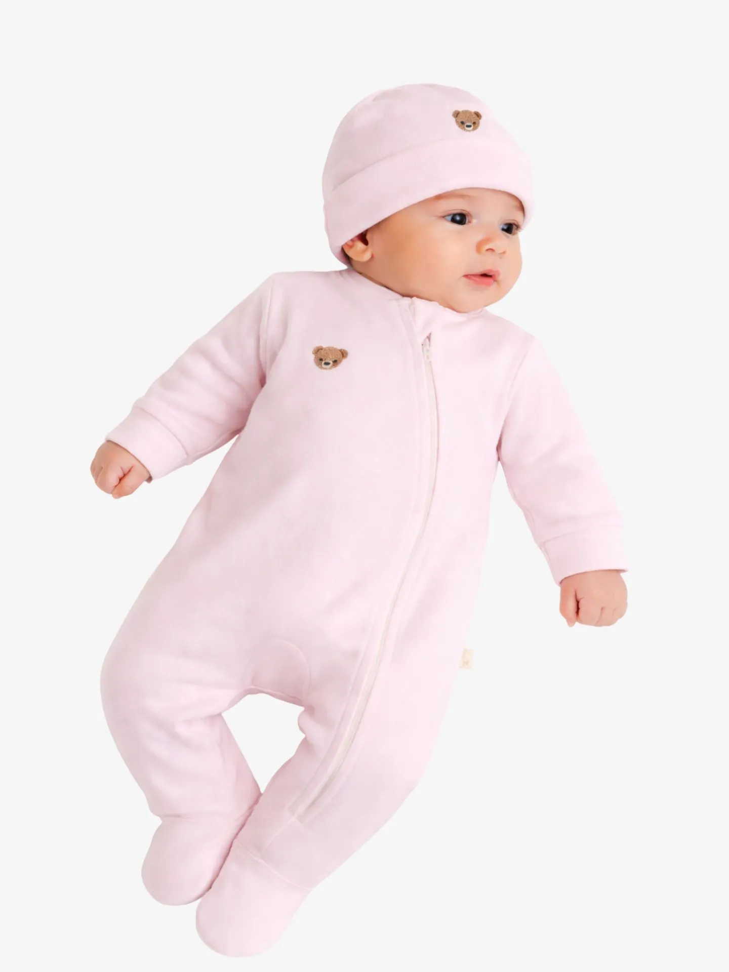 Boxpakje van het merk Baby Gi. Het katoenen boxpakje met voetjes heeft een platte Peter Pan kraag, geborduurd beertje op het borstzakje en een drukknoopsluiting aan de voorzijde.