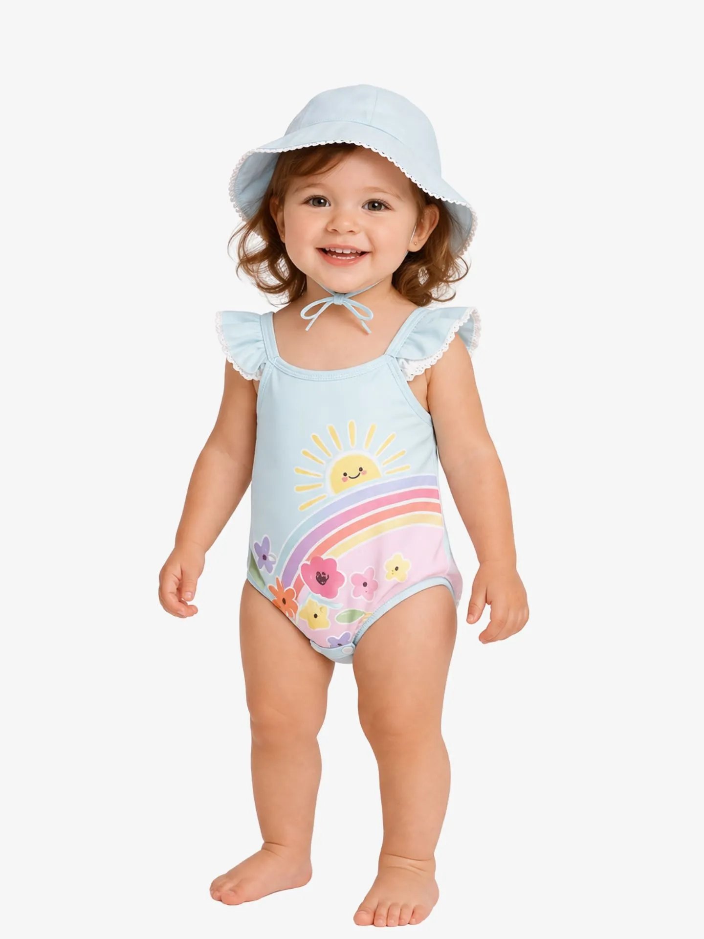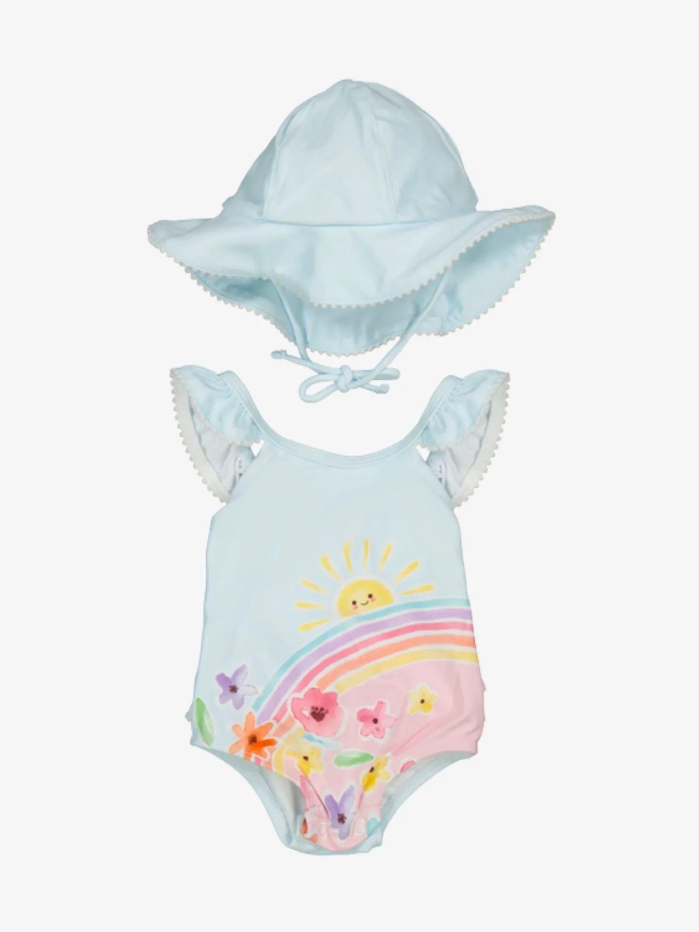 2-delige set van het Spaanse merk Mayoral. De set bestaat uit een badpak en zonnehoed. Het badpak heeft een opdruk aan de voorzijde en ruches op de schouderbandjes. Het zonnehoedje kan vastgeknoopt worden met de koordjes aan de binnenzijde van de hoed.