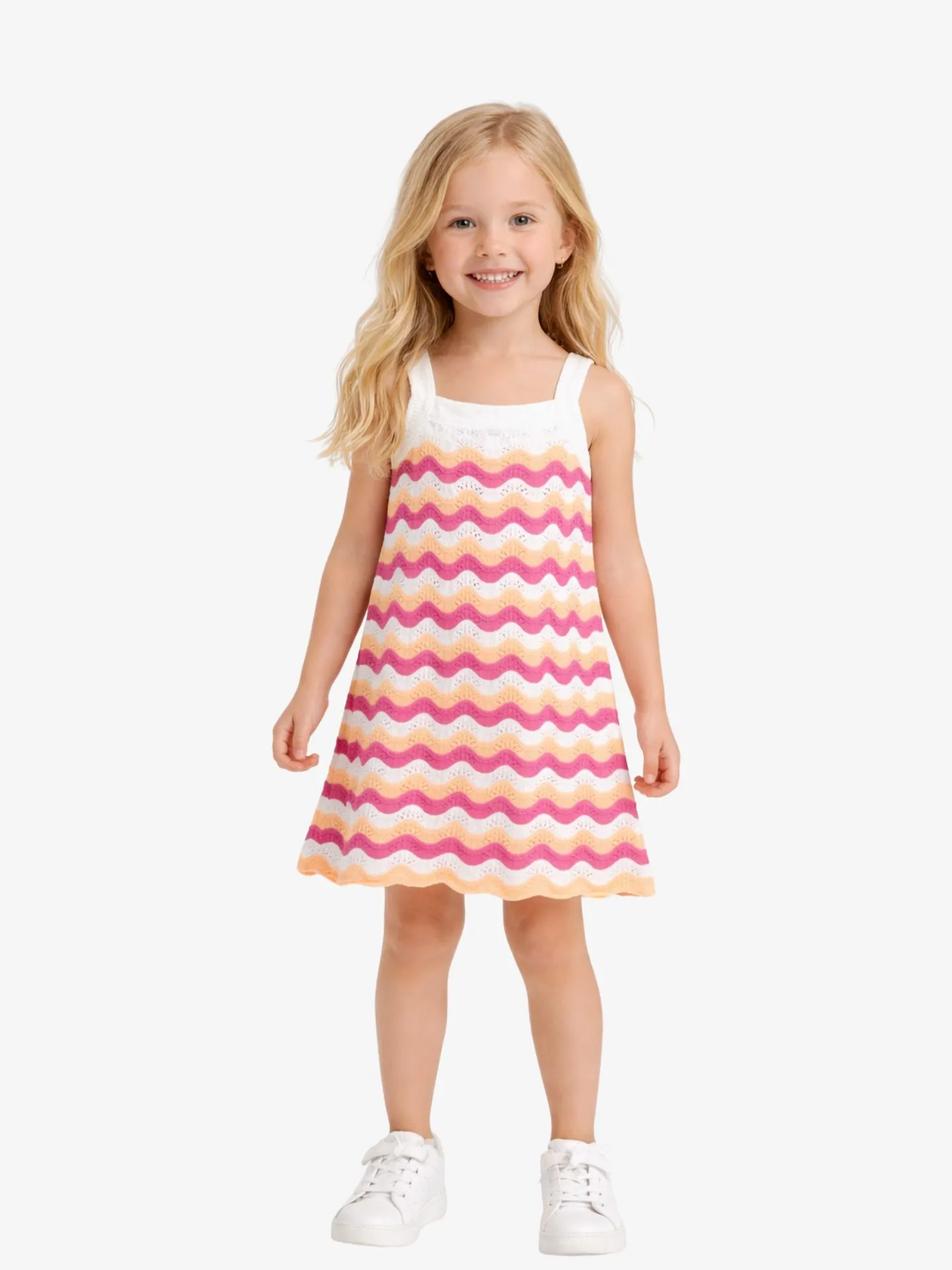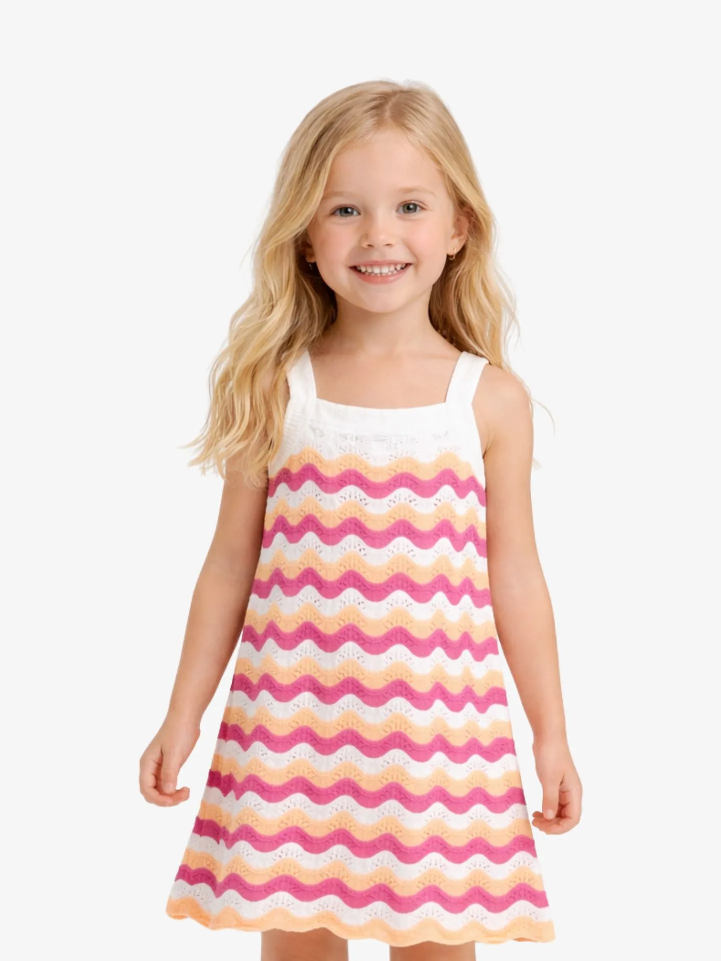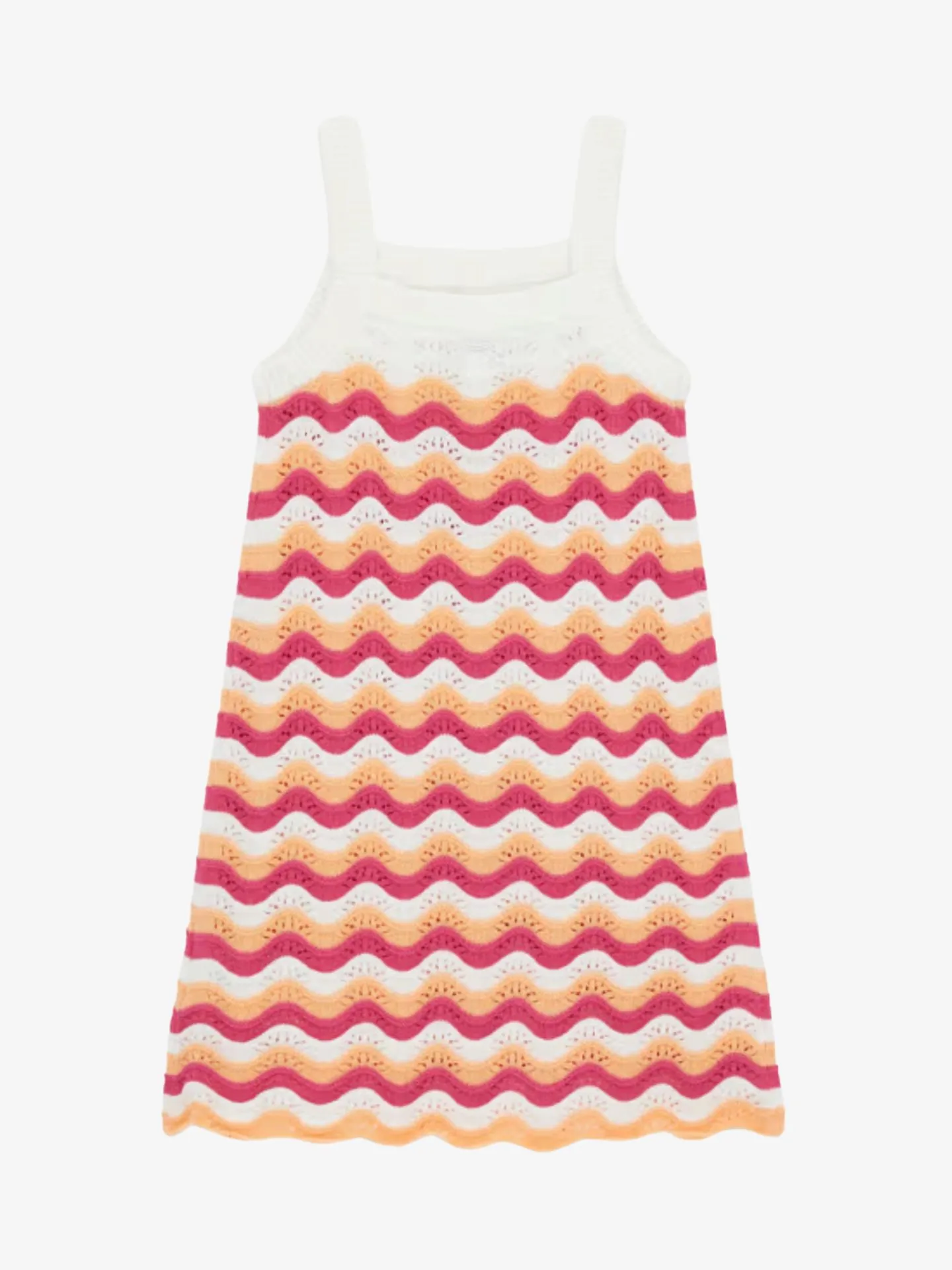 Laat je kleine meid stralen in deze prachtige gehaakte jurk van Guess Kids. Deze vrolijke zomerjurk is een echte eyecatcher dankzij het unieke zigzag-patroon (chevron) in levendige tinten fuchsia roze, warm oranje en fris wit. De jurk is vervaardigd uit een hoogwaardige, zachte katoenmix in een verfijnde ajour-gebreide structuur, wat zorgt voor een luchtig en comfortabel gevoel tijdens warme zomerdagen. Het mouwloze ontwerp met brede schouderbanden en een rechte halslijn geeft de jurk een klassiek en tijdloos silhouet. Wat dit item echt bijzonder maakt, zijn de golvende randen aan de onderzijde, die zorgen voor een speelse en meisjesachtige touch. Vervaardigd uit 100% zacht katoen, biedt deze jurk niet alleen een luxe uitstraling, maar ook de duurzaamheid en bewegingsvrijheid die essentieel zijn voor kinderen. Of het nu voor een zomers tuinfeestje is of een dagje naar het strand, deze Guess-jurk is de perfecte combinatie van modieuze flair en dagelijks gemak.