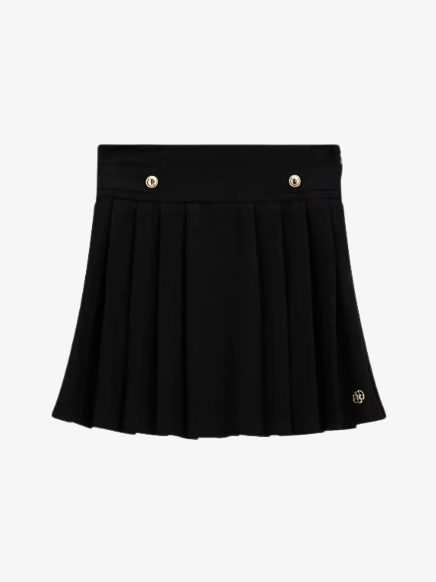 Het Guess Kids Punto Milano Rok in de kleur Zwart heeft een stretch kwaliteit, ritssluiting, plooi model en goudkleurige knopen. Combineer met een Guess trui.