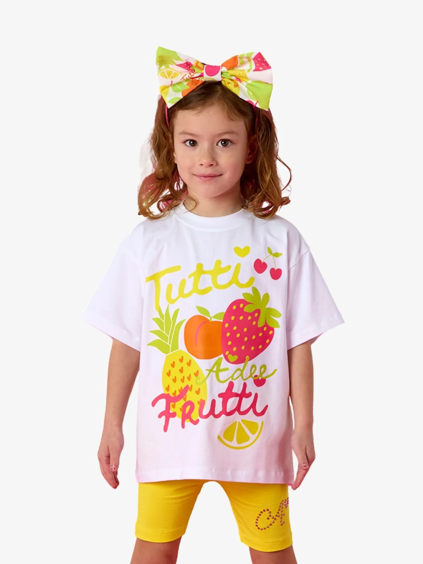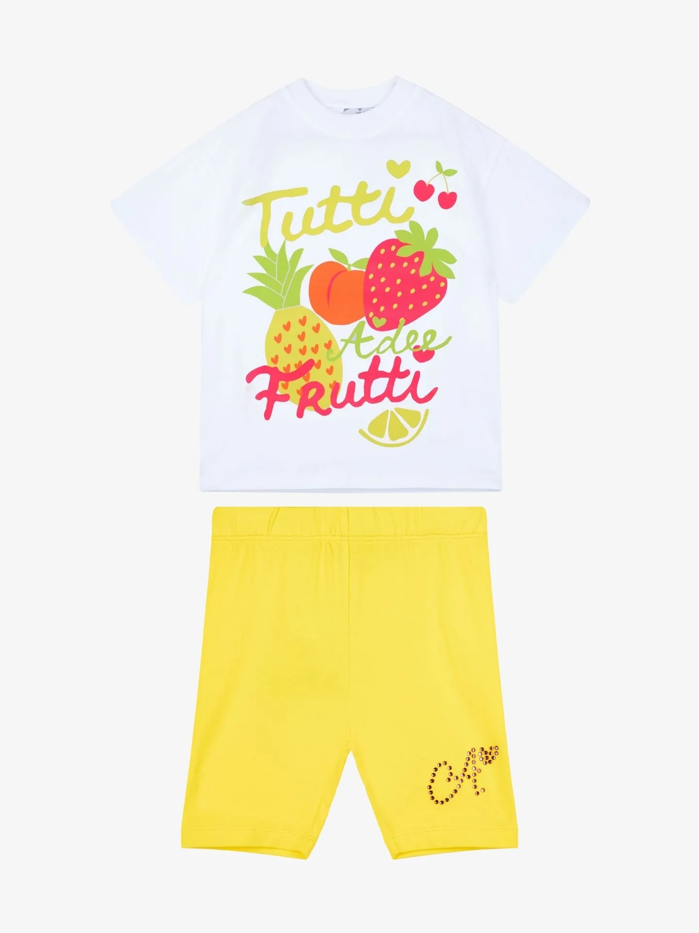 De Trinity-set bestaat uit een oversized T-shirt met Tutti Frutti-print, gecombineerd met een gele fietsbroek met een logo van strass-steentjes op een pijp.
