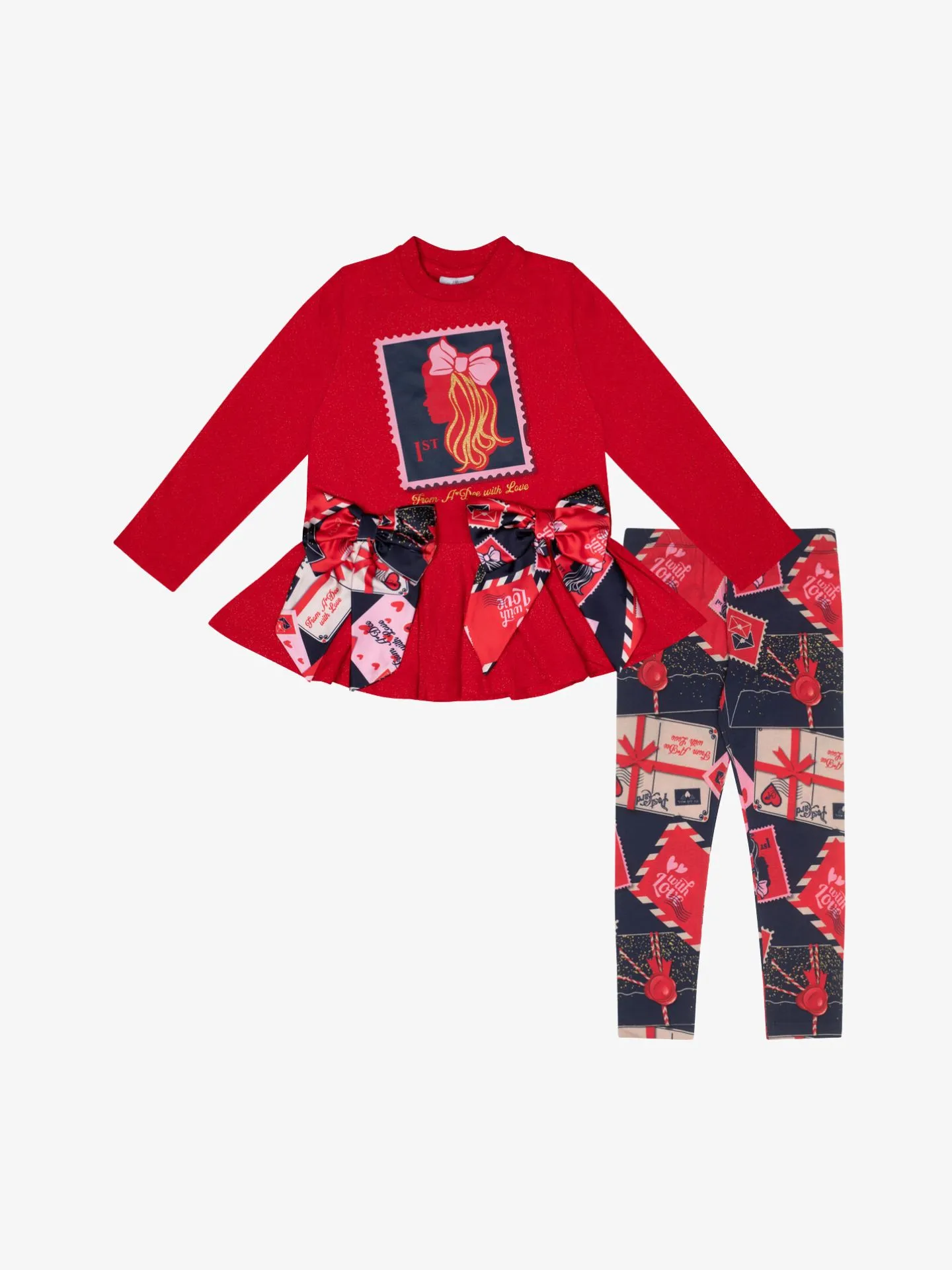 De Adee Reese Set in de kleur Red bestaat uit een tuniek met bijpassende legging. De tuniek heeft een uitlopende onderkant, strikjes aan de voorkant en achterkant. De tuniek heeft een all over lurex rode stof.