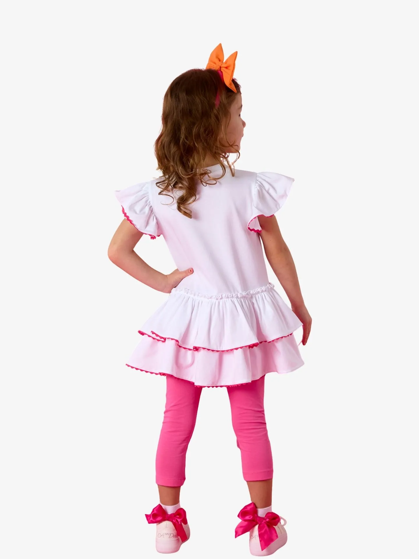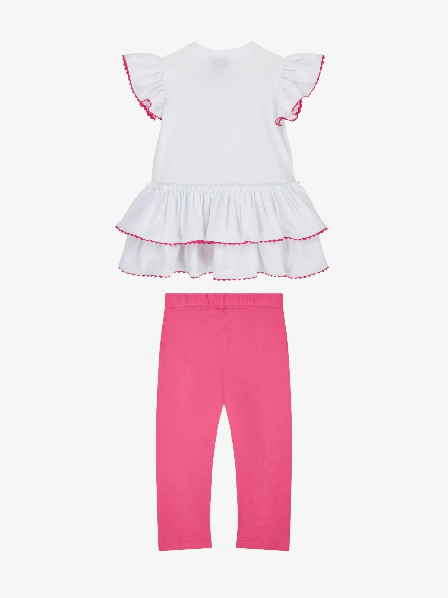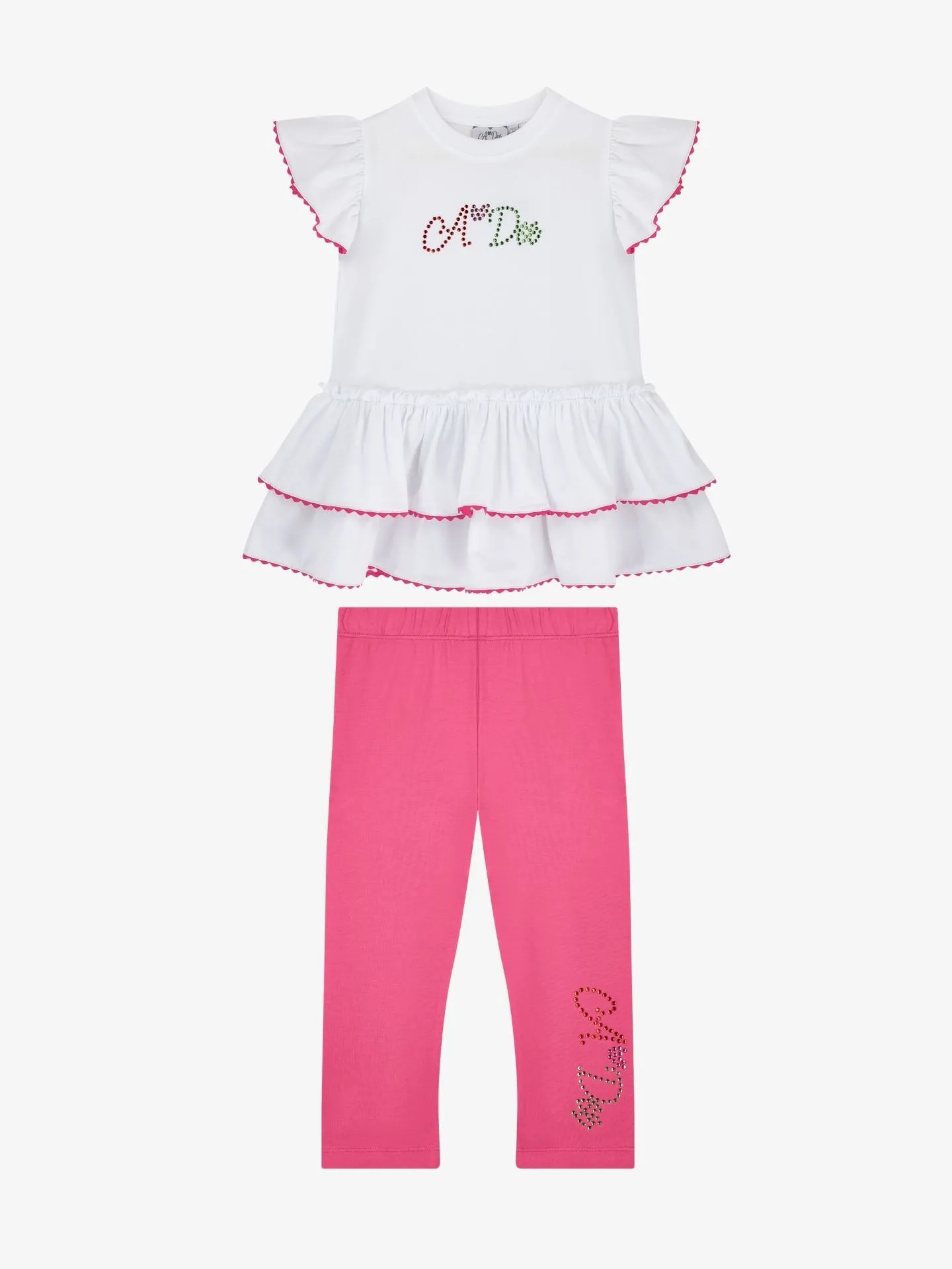 De Tallulah legging set bestaat uit een witte top met mouwen van zigzagband en meerdere lagen zigzagband. Gecombineerd met een roze legging met een strass-logo op een pijp.