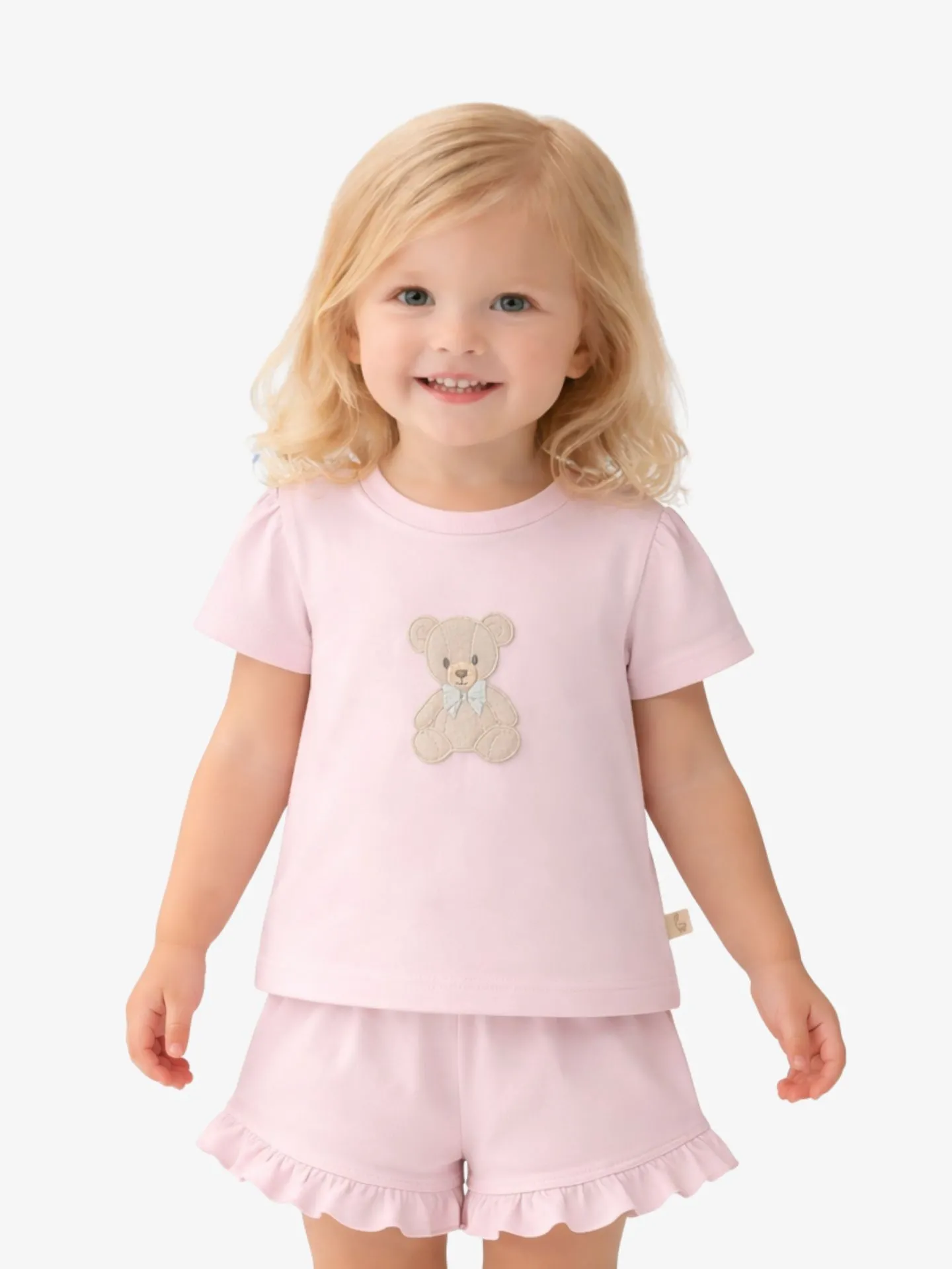 Dit beeldschone tweedelige setje van Baby Gi is perfect voor warme dagen, logeerpartijtjes of gewoon als comfortabele vrijetijdskleding. Het combineert een lief ontwerp met zachte materialen voor de gevoelige huid. Materiaal: De set is gemaakt van 100% zacht katoen (jersey), wat ademend en comfortabel is. Design Top: Het roze T-shirt met korte pofmouwtjes heeft een ronde hals en is versierd met een geborduurde beige teddybeer op de borst, compleet met een klein strikje. Design Broekje: Het bijpassende lichtroze shortje heeft een comfortabele elastische tailleband en is afgewerkt met schattige ruches (franjes) langs de pijpen voor een speelse uitstraling. Collectie: Dit specifieke ontwerp is onderdeel van de Teddy & Me of Sweet Teddy collectie van Baby Gi.