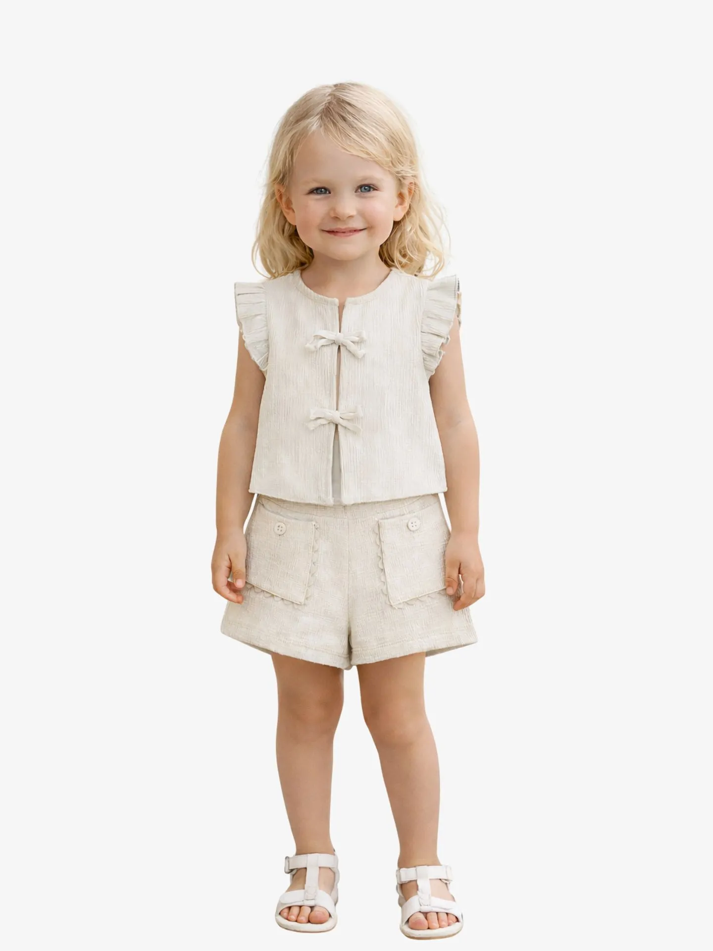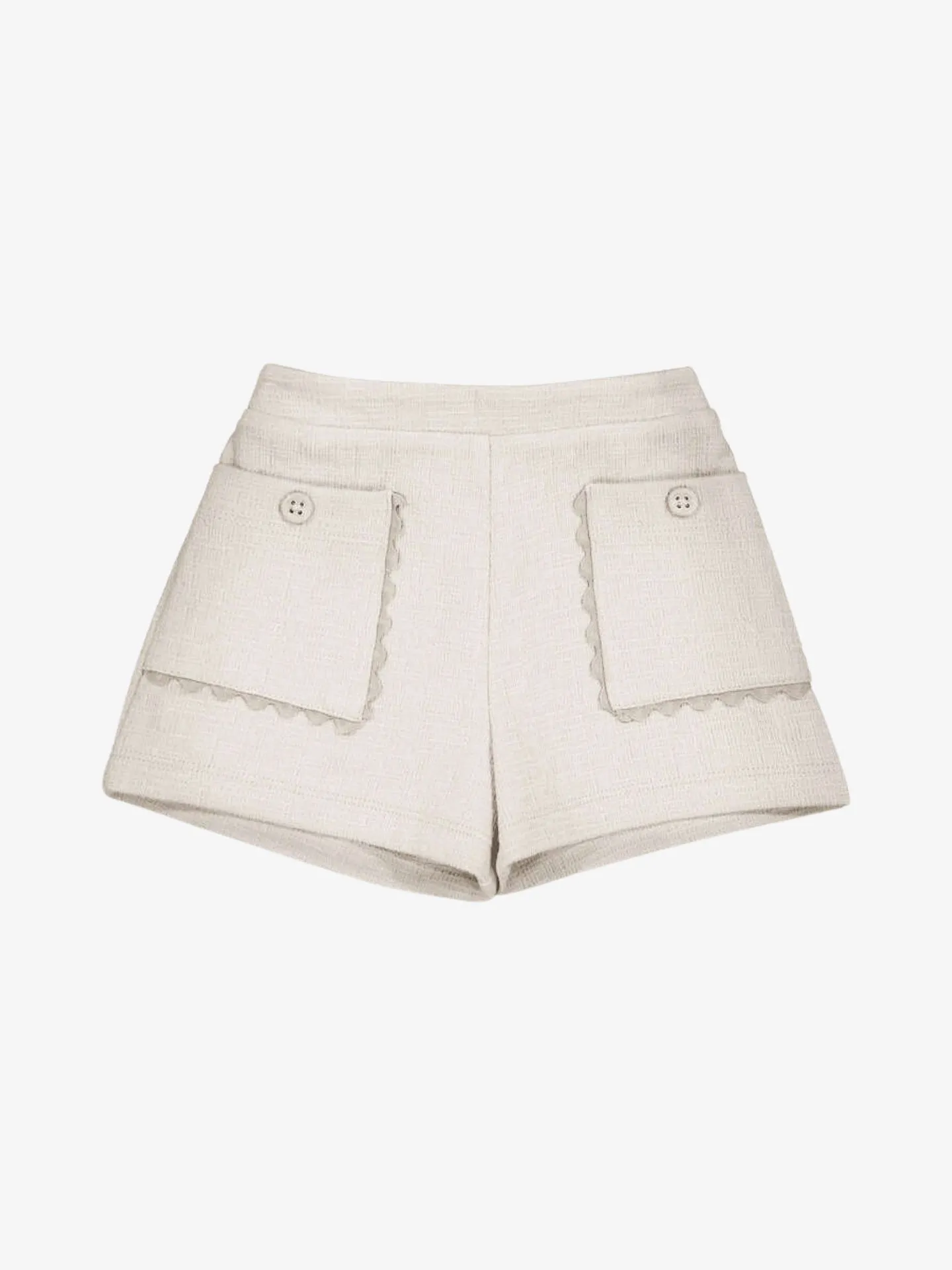 Katoenen short van het Spaanse merk Mayoral. De hort heeft grote opgestikte zakken aan de voorzijde bewerkt met sierbiesjes en een elastische tailleband met verstelbaar elastiek.