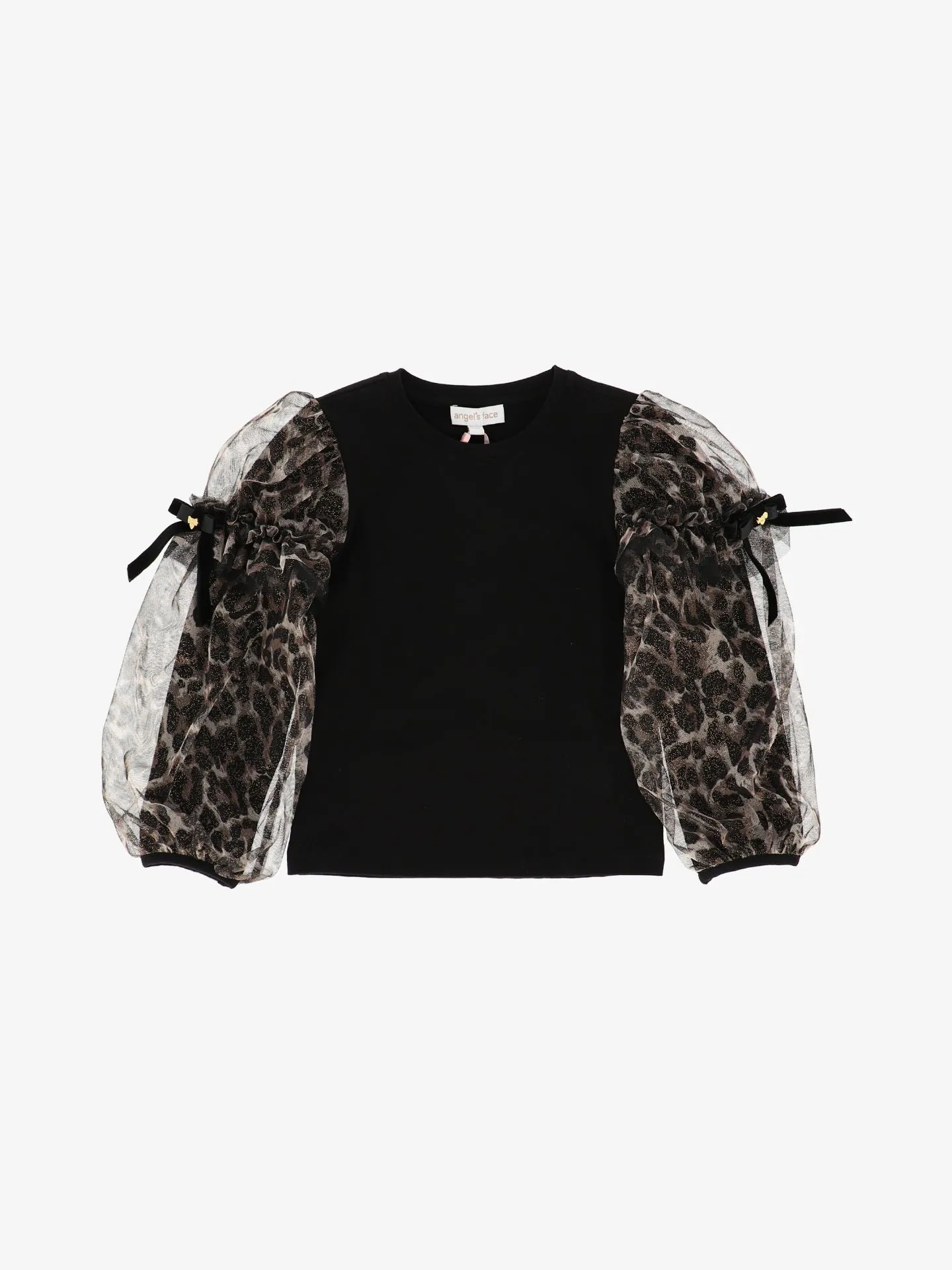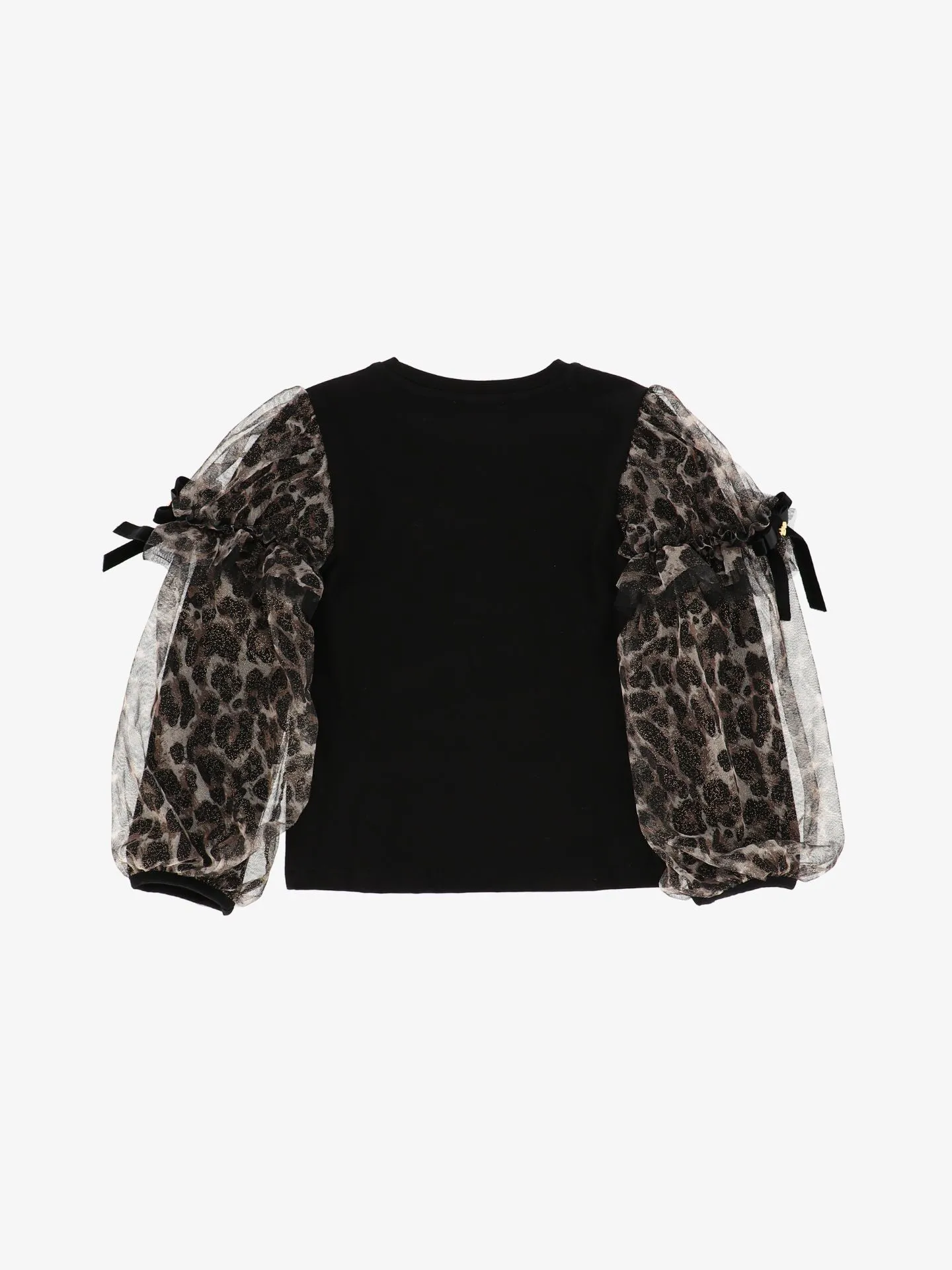 Voel je extra speciaal in deze prachtige luipaardtule top. De zachte jersey top heeft luchtige, doorschijnende tule mouwen met een mooie luipaardprint en fluwelen strikken aan beide kanten. Perfect voor feestjes of een chique outfit voor elke dag.