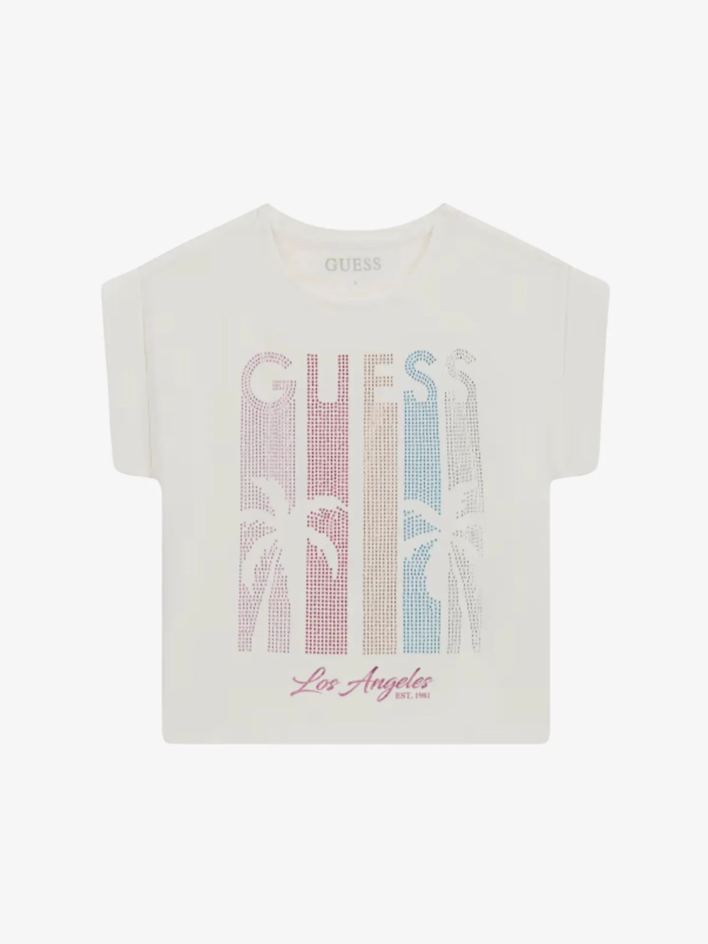 Dit witte Guess T-shirt voor meisjes heeft een opvallend gestreept logo met palmbomen, versierd met strass-steentjes in diverse kleuren, waaronder roze, blauw, en goudtinten. De strass-steentjes vormen de woorden GUESS en daaronder in een sierlijk lettertype de tekst Los Angeles. Het shirt is gemaakt van katoenen jersey voor een comfortabele, normale pasvorm en heeft een klassieke ronde halslijn en korte, licht omgeslagen mouwen. Dit item, vaak beschreven als een boxy of cropped model, vangt die iconische Californische stijl waar het merk sinds 1981 bekend om staat.