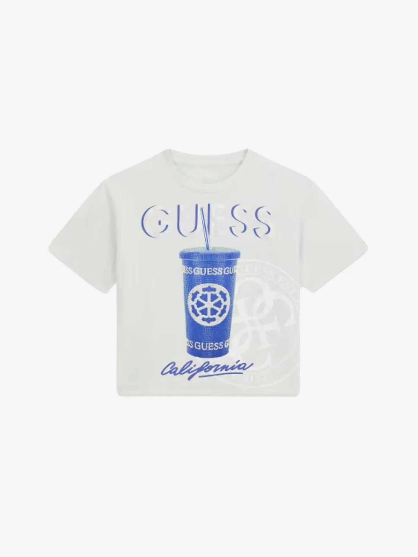 Dit witte Guess T-shirt voor kinderen heeft een opvallende blauwe grafische print op de voorkant. Centraal in het ontwerp staat een blauwe beker met een rietje, omringd door het herkenbare Guess-logo en de tekst California in een elegant lettertype. De tekst Guess is ook bovenaan de print te zien.