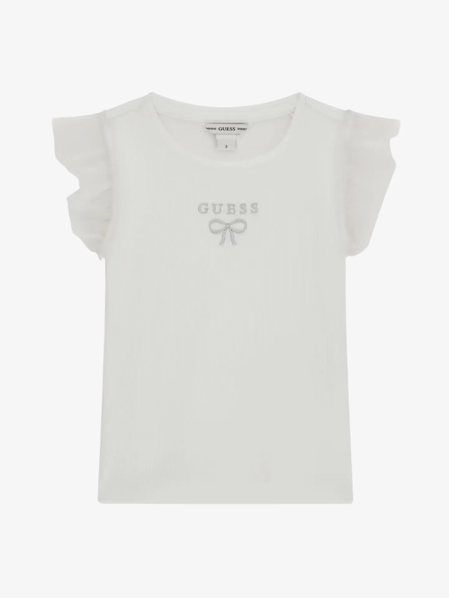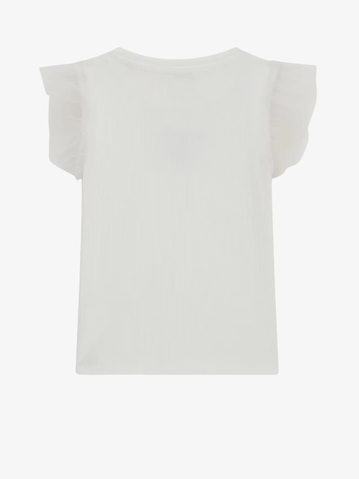 Witte top van het Amerikaanse merk Guess. De mouwloze top heeft een ronde hals, tulle ruches langs de armgaten en een opdruk aan de voorzijde bewerkt met steentjes.