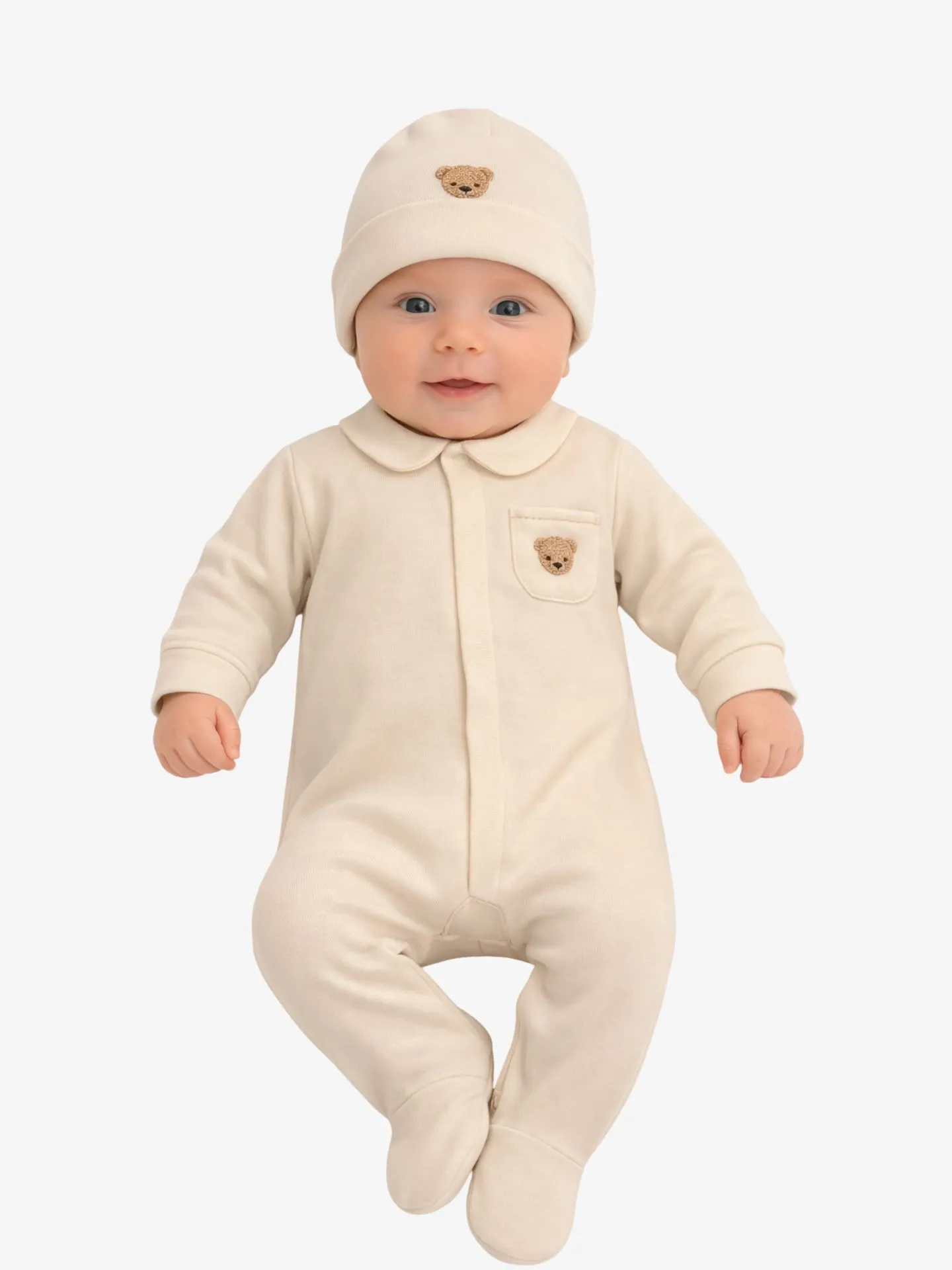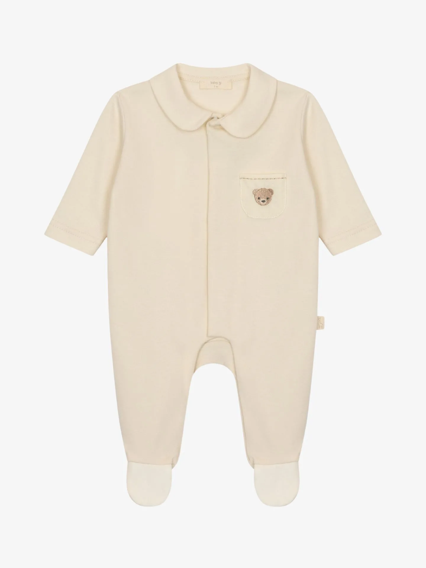 Boxpakje van het merk Baby Gi. Het katoenen boxpakje met voetjes heeft een platte Peter Pan kraag, geborduurd beertje op het borstzakje en een drukknoopsluiting aan de voorzijde.