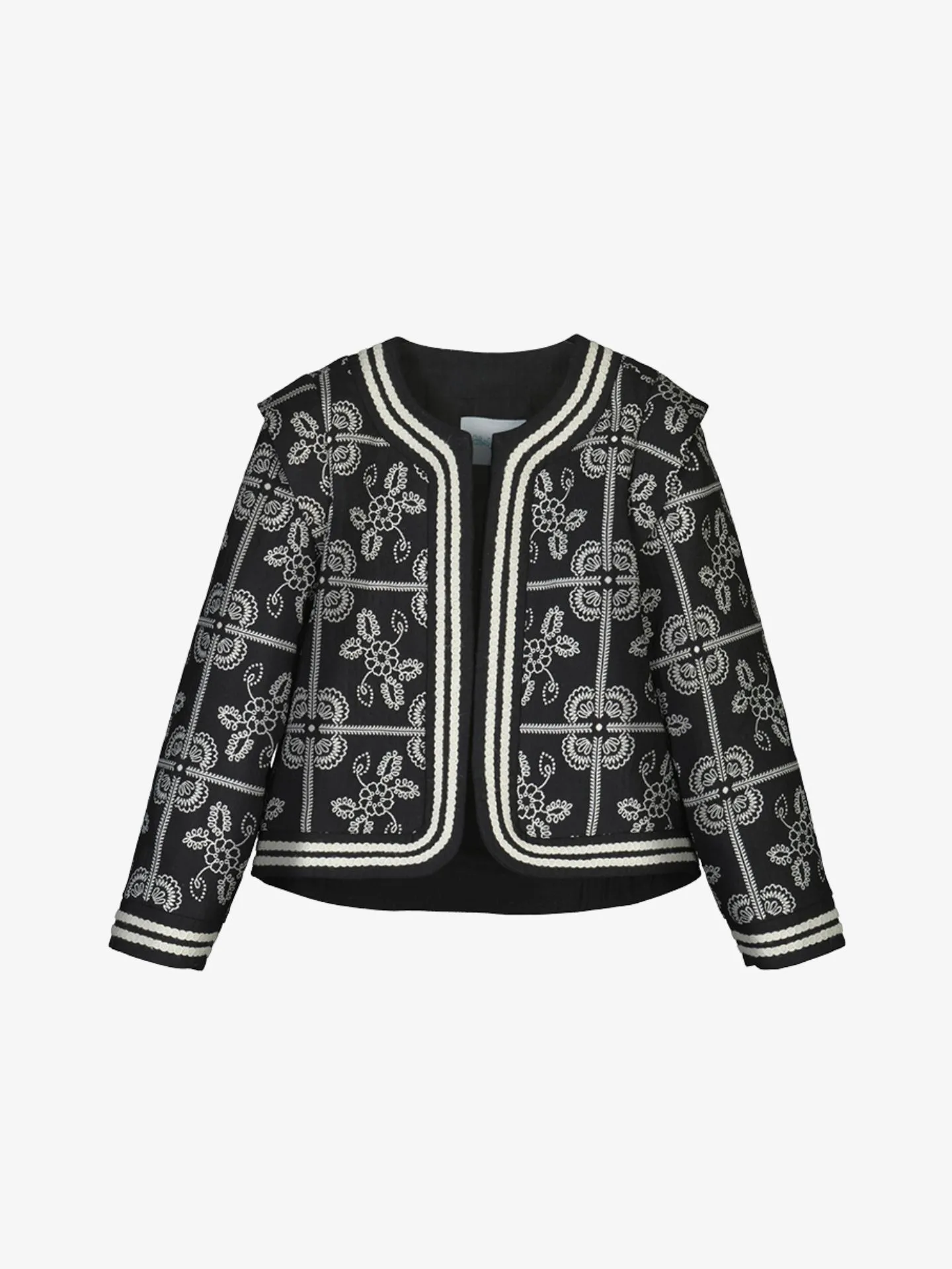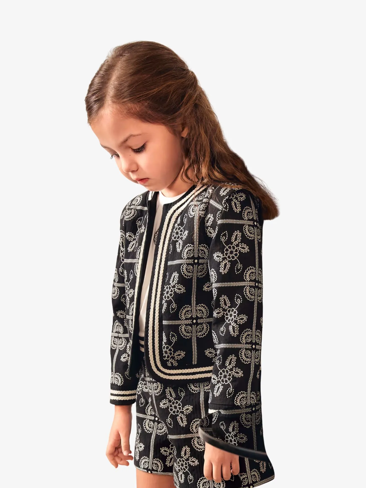 Zwart jasje van het Spaanse merk Abel&Lula. Het jasje heeft lange mouwen en een contrasterende biezen en all-over print. Combineer het jasje met het bijpassende shortje.