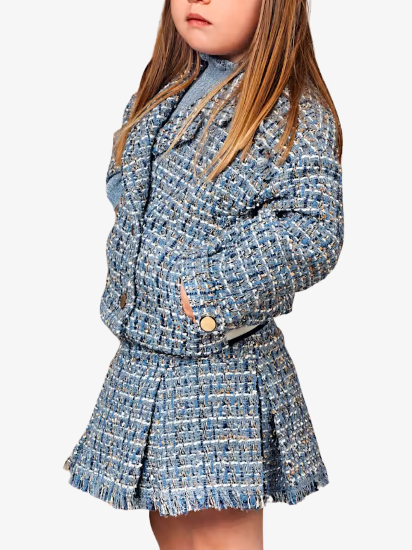 Tweed rok van het Spaanse merk Abel&Lula. De blauwe tweed plooirok heeft een ritssluiting aan de zijkant en verstelbaar elastiek in de taille. Combineer de rok met het bijpassende jasje, pet en longsleeve.