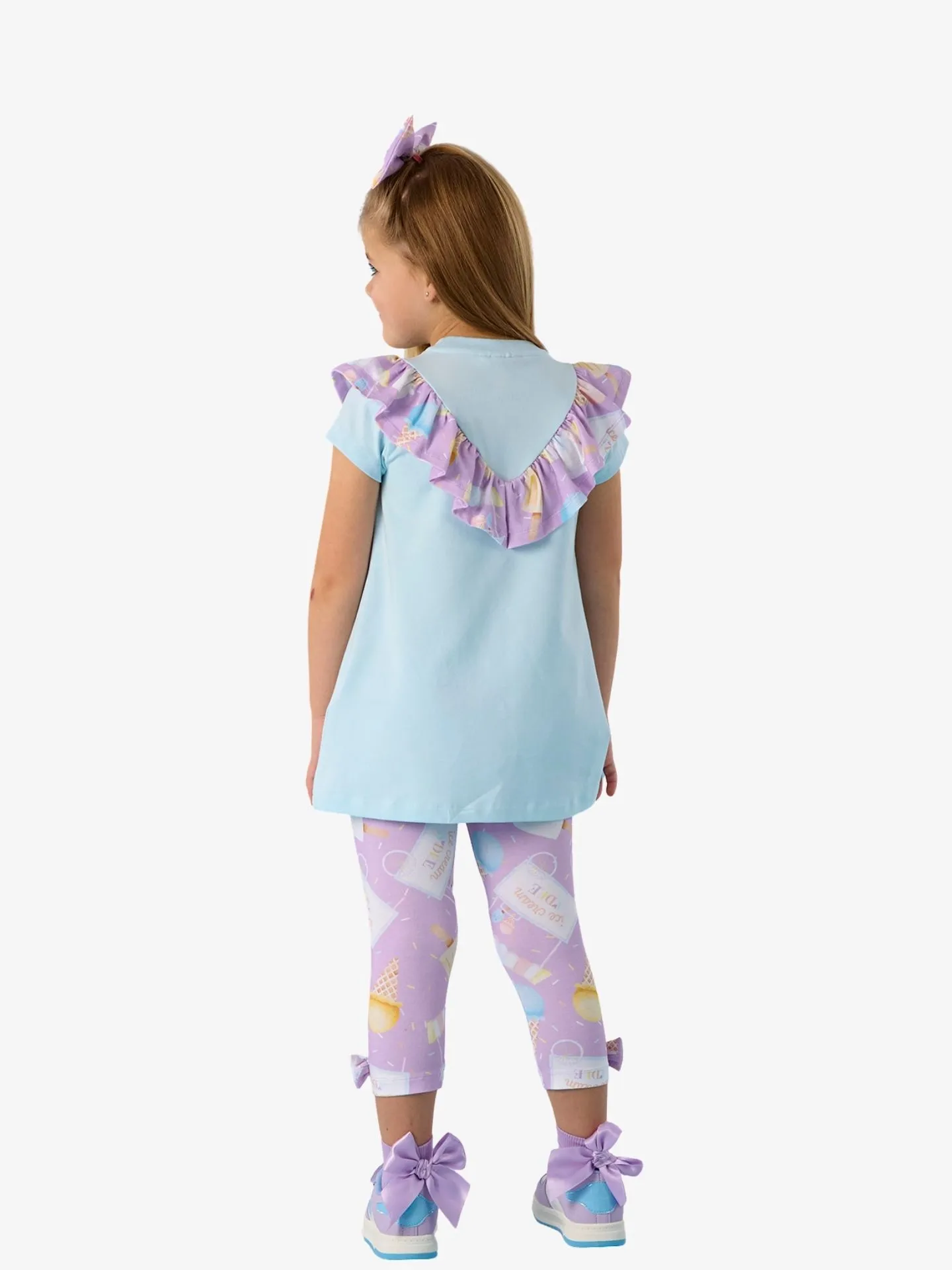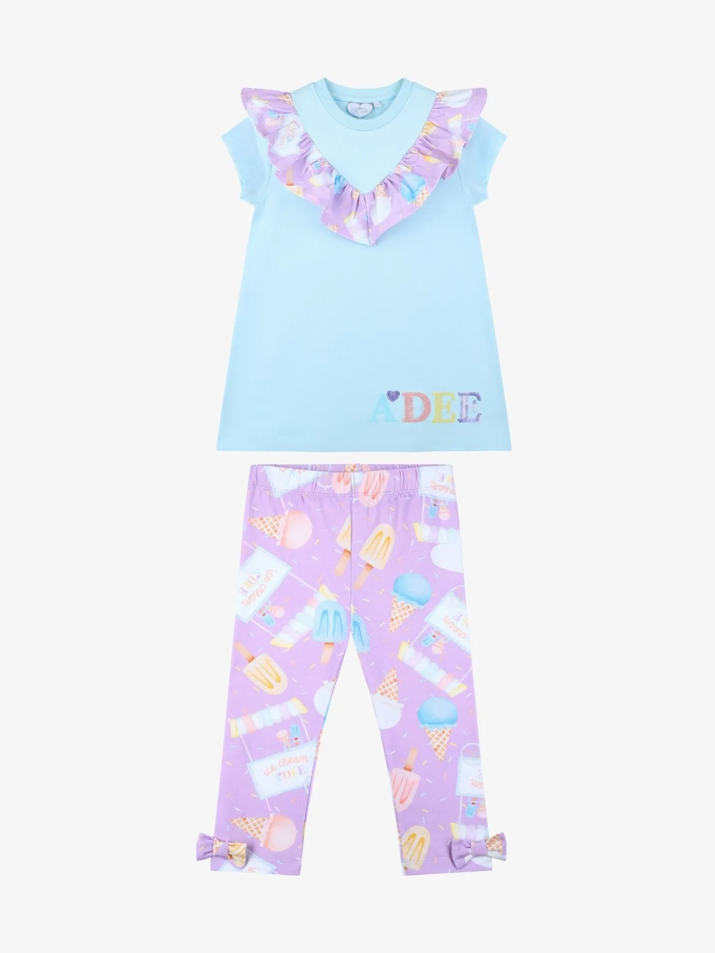 De Scarlett legging set bestaat uit een blauwe tuniek met ijsjesprint en ruches op de borst, afgewerkt met pailletten. De bijpassende legging met ijsjesprint is afgewerkt met twee strikjes aan elke enkel.